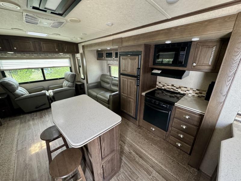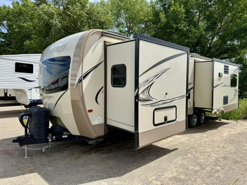 Beautiful and spacious interiors are what you will find throughout each Flagstaff Classic Super Lite travel trailer. Each floor plan is open and inviting. You will find Driftwood interiors with a decorative cove trim along the ceiling and overhead cabinets. With the WiFi Ranger Wifi Booster you can easily stay connected with your electronic devices. There is also a digital AM/FM/DVD with "Bluetooth" technology. Along the exterior there is a radius roof with vaulted interior ceilings, a one piece seamless roofing membrane, a power awning, plus so much more! The Standard Package is also available on each model which features an upgraded 22" gas oven, solid surface Corian kitchen countertops, a residential Serta mattress upgrade, and thermostatically controlled heated holding tanks, plus so much more!