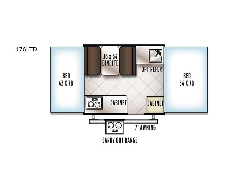 Take your family on an adventure above ground in this Flagstaff LTD Series 176LTD folding pop-up camper by Forest River. Meal cooking is made easy with the indoor kitchen as well as the carry out range. You can enjoy your meals either at the booth dinette which can also be transformed into a sleeping space or pull a chair up underneath the 7' awning. At night, you can choose to enjoy a good night's rest in either the front 54"x 78" bed or the rear 42"x 78" bed.