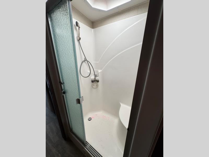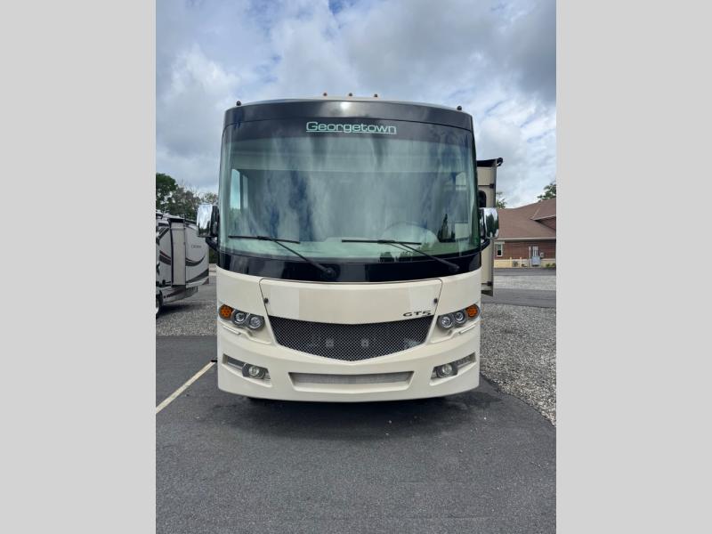 For comfort and style you will want a Forest River Georgetown 5 Series GT5 class A motor home. Along the exterior there is a "Super Storage" rear cargo compartment, an outside shower, as well as a stylish fiberglass front cap with lighted logo, LED accent lights and automotive bonded front windshield. As you step inside be prepared to be wowed from the stainless steel three-burner cooktop with oven to the solid surface countertops. In the cockpit there is a custom dash with ABS side consoles, drink holdrers, and a 110V outlet/USB. You will also enjoy the convenience of the MyRV touchscreen with wireless technology and more!
