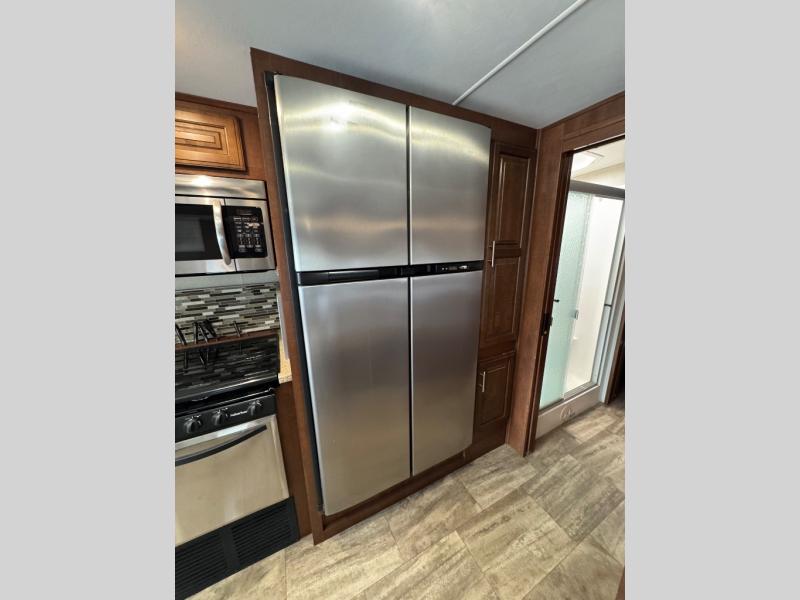 Load up your family of six and see just how easy it is to camp in style and comfort with this Georgetown 5 Series GT5 31R5 class A motor home. Sleeping room can be found at the sofa, Dream Dinette, and the king bed. Once you have reached your destination then you can easily visit or entertain a guest or two. The front passenger work station makes it easy to get a little work done while you are away from home. In the kitchen you will find all of the amenities needed to create your favorite meals for your family while you are away from home. Here there is an 18 cu. ft. stainless steel refrigerator, a three burner range, plus a microwave.