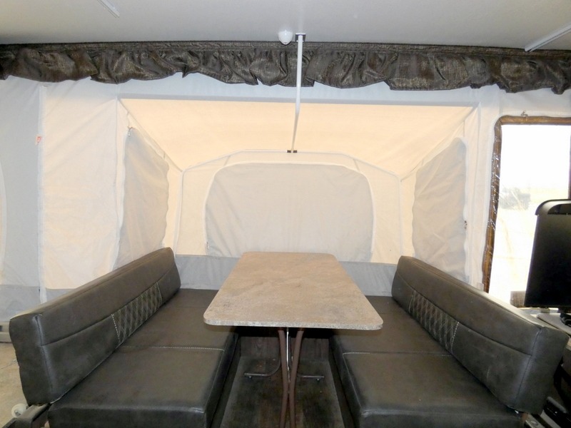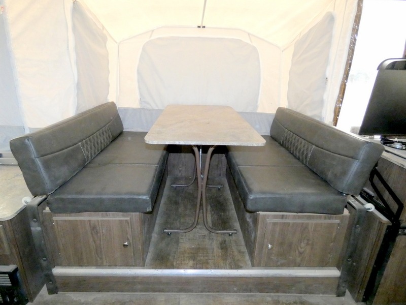 Opposite find a booth dinette slide out. During the day you can enjoy meals here, and at night the dinette makes into additional sleeping space.