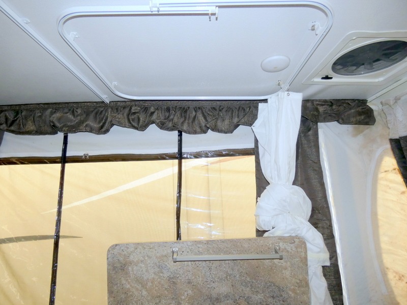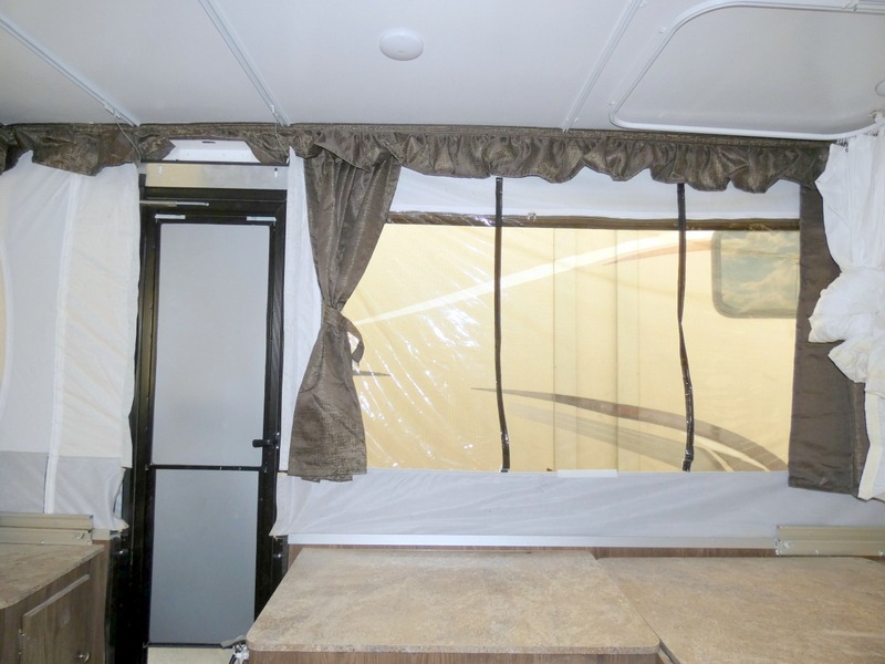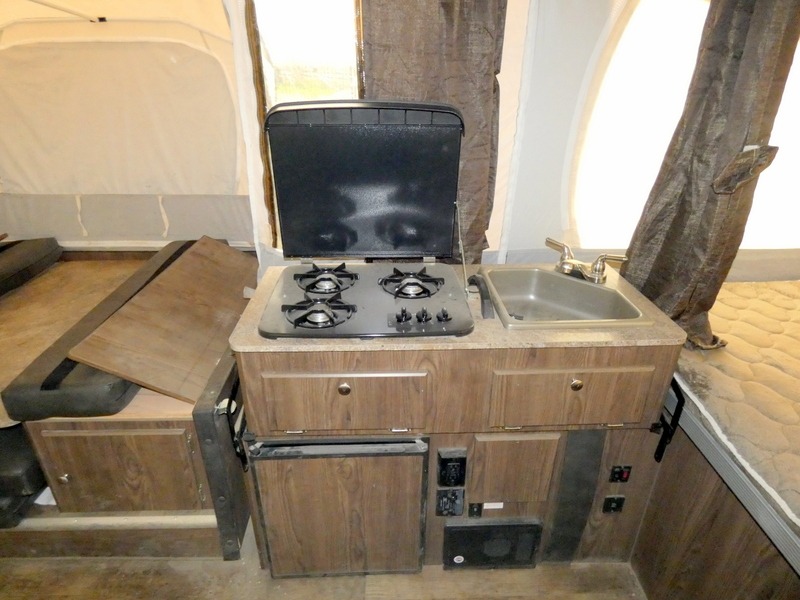 The single slide on this folding pop-up camper helps to open up the floor space. As you enter this Rockwood Extreme Sports 232ESP by Forest River you will find a shower cassette toilet, rear queen tent bed and a front king. Plus there is an exterior front deck for storing your toys and outside gear!