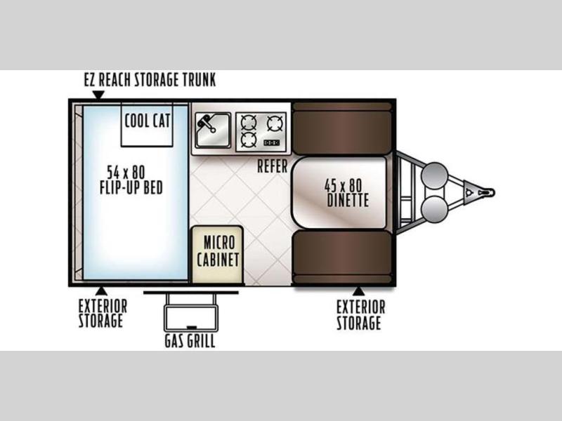 If you have been looking for inside comforts with an exterior storage deck to carry along your favorite toys or extra gear, stop looking! This Rockwood Extreme Sports Package Hard Side A-frame model A122THESP by Forest River offers an outdoor gas grill with a worktable allowing you to be outside with your family and friends while grilling burgers. You even have the option of cooking inside on the swing galley. When it's time to retire for the night, the flip-up bed and dinette both provide a comfortable inside spot. This model has even been prepped for solar panels if you choose to add that convenience for those off-grid adventures. The exterior front storage deck allows a space for your toys and additional gear on the 57" x 84" expanded metal decking, plus there is storage inside as well.