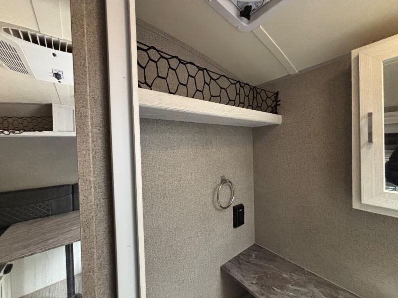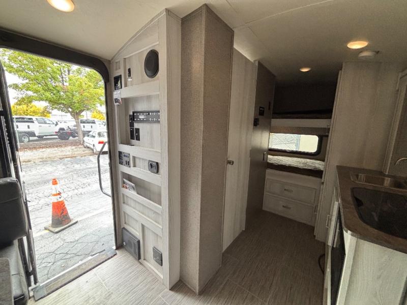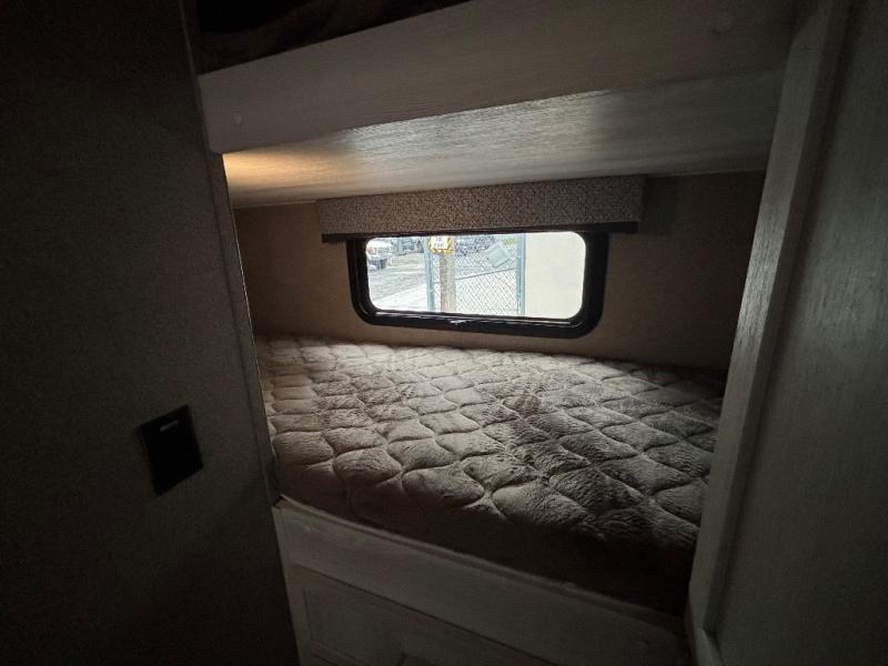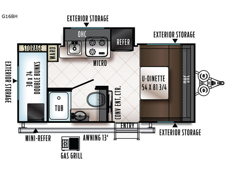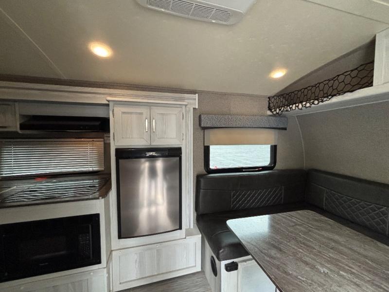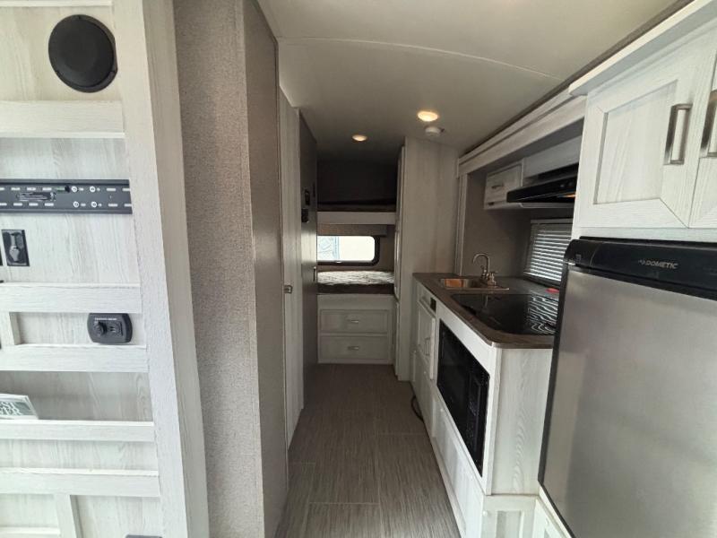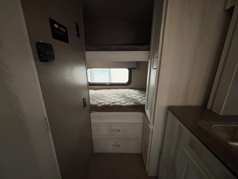 The 16BH floor plan features a rear bunk area perfect for children or guests, plus a convertible dinette and bed space—offering the flexibility to sleep up to four people. A single slide-out expands the living and kitchen area, giving everyone room to relax and enjoy the journey.