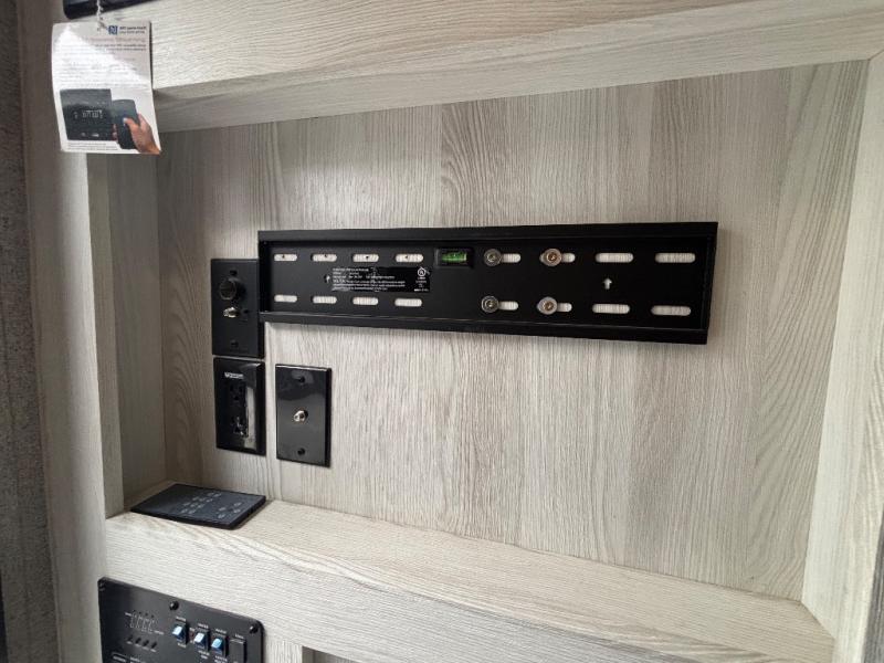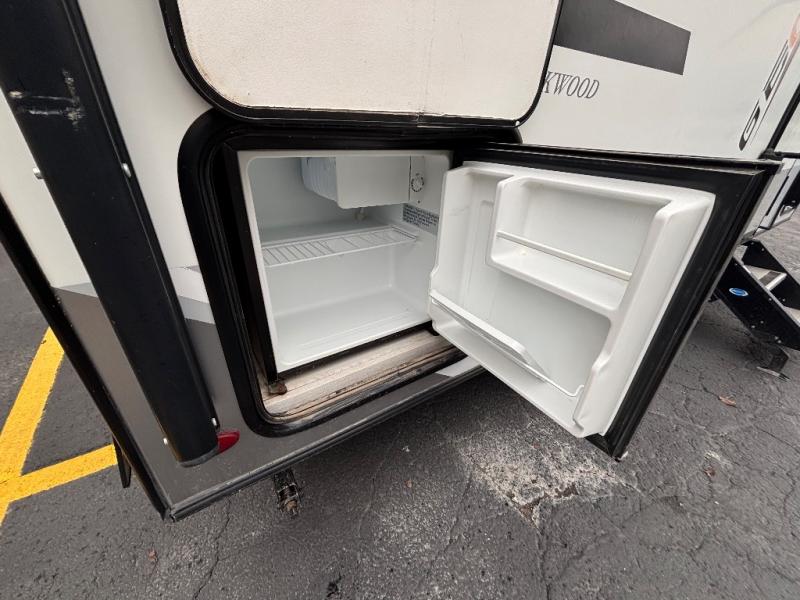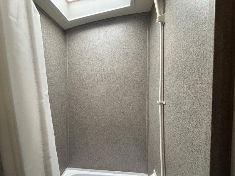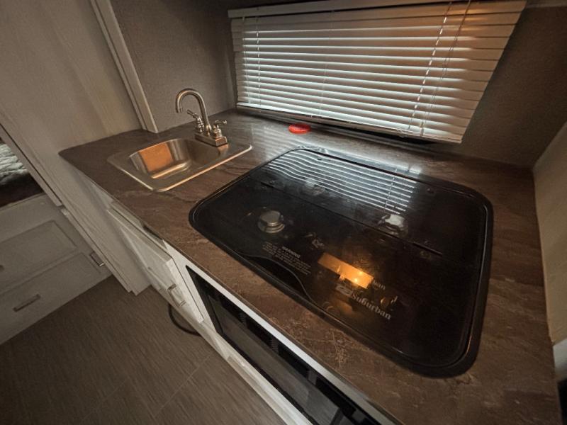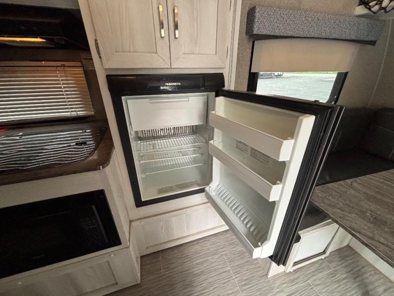 Inside, you’ll find a well-equipped kitchen with a three-burner stove, mid-size refrigerator, microwave, and ample storage space. The full bathroom with shower and toilet provides convenience and comfort—no need to rely on campground facilities when you’re on the go.