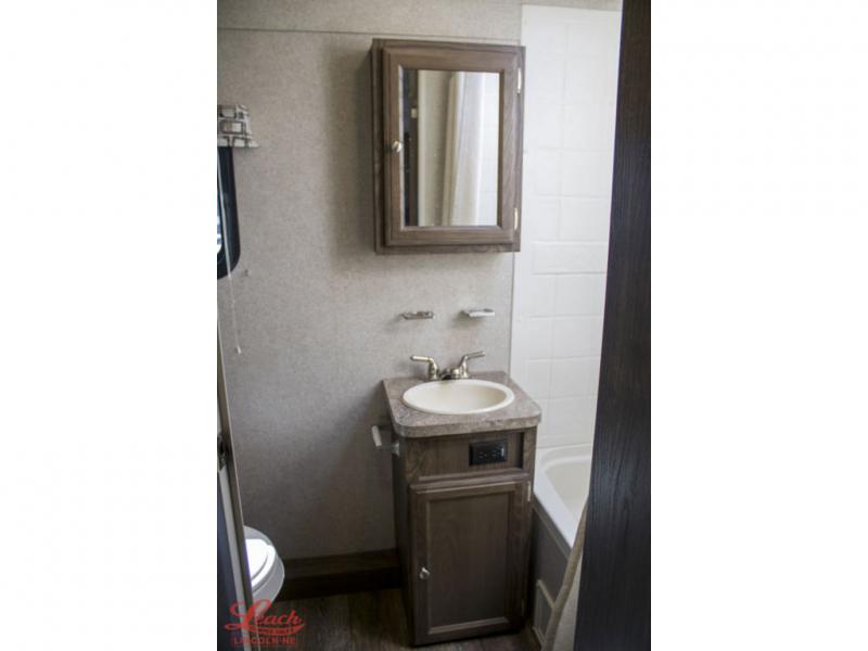 This Rockwood Mini Lite travel trailer is a smaller unit, but it would be just what you need for a weekend trip for a small family or an extended stay for a couple. You have plenty of space for storing your items throughout your journey. There are dual wardrobes, one on either side of the queen sized bed. There is also some overhead cabinetry throughout this unit. Choose to take a look at this model today.