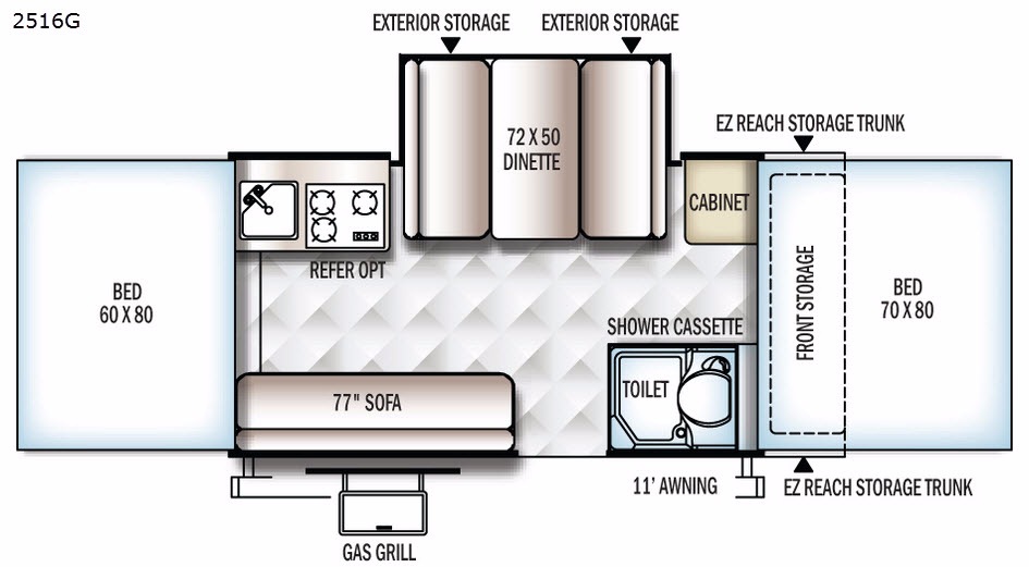 Outside you will find a front EZ Reach storage trunk, a 11' awning, and a gas grill, plus much more!