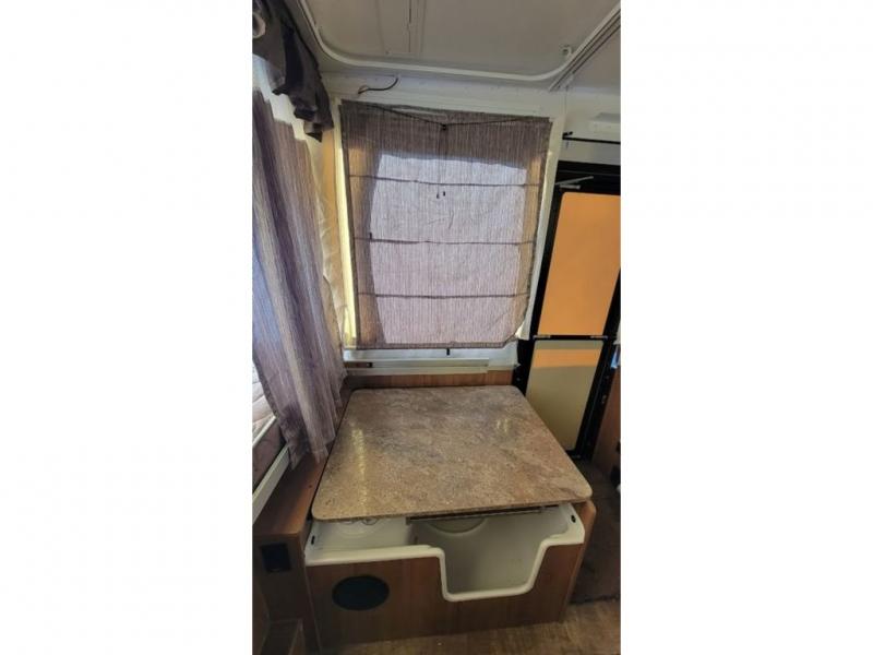 Along the road side wall you will find a single slide out 72" x 50" booth dinette. Next to the slide there is a swing galley with a three burner range and single sink. An optional refrigerator is under the three burner range if you choose to add that amenity.