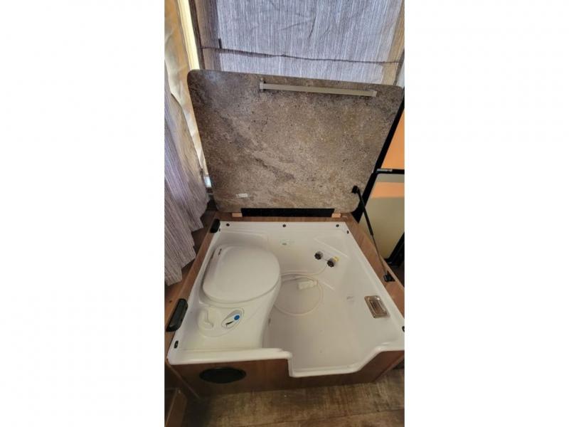 To the right of the entry, there is a shower cassette and toilet for an added convenience while camping. The opposite corner holds a cabinet for storage.