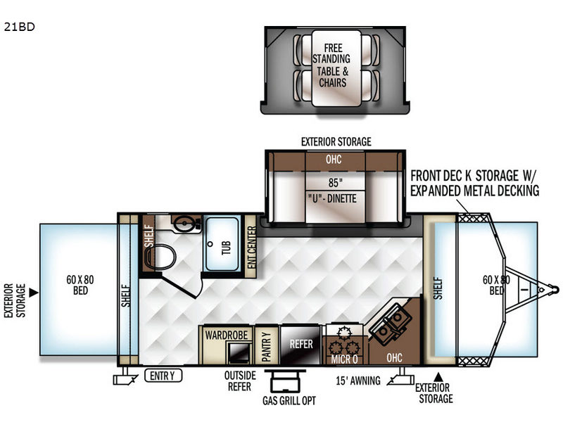 Outside you can load up and store your play toys on the front deck storage with expanded metal decking. Plus there is additional outside storage compartments. The curb side awning gives protection from the outside elements when needed. If you enjoy grilling you can choose to add an optional gas grill. Plus the outside refrigerator is a great place to store drinks or snacks.