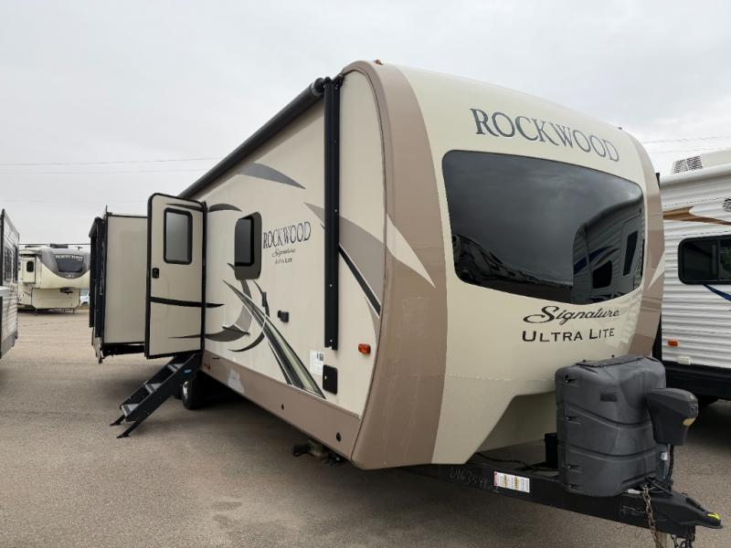 The Forest River Rockwood Signature Ultra Lite travel trailers are anything but ordinary. You will love all of the space inside each model! Once you step inside you will find Driftwood cabinetry, solid wood and raised panel doors and drawers, plus LED lighting throughout. Outside there is a power awning with adjustable rain and dump, LED lights and a seamless one piece roof, plus more! Each model also includes a Standard Package which features the following an upgraded 22" gas oven, solid surface Corian kitchen countertops, outside speakers, and so much more! Why wait? Get your Rockwood Signature Ultra Lite travel trailer today!