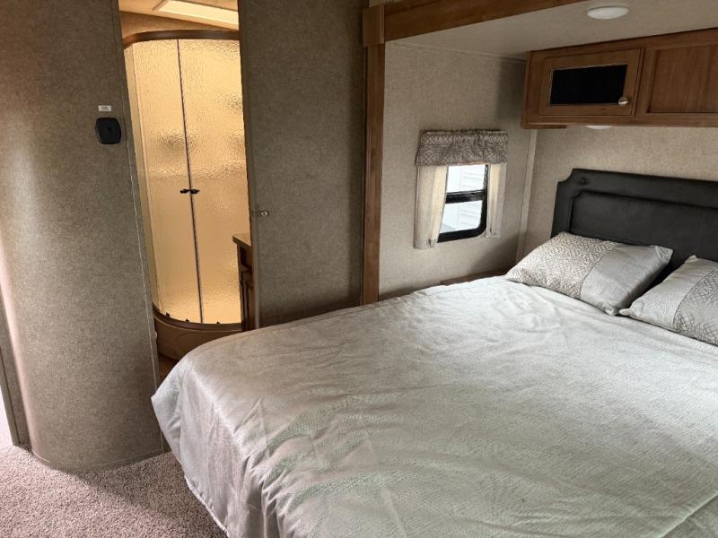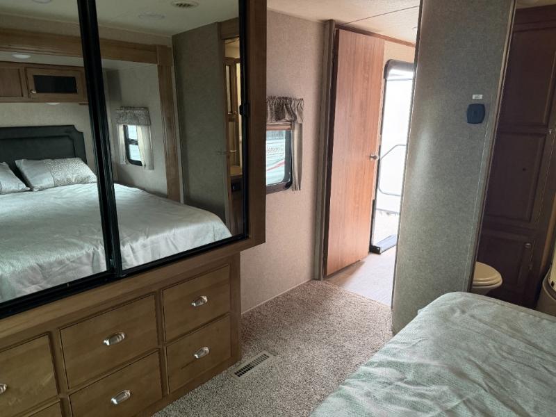 What I liked most: Exterior color and graphics are classy with window no trim look. Floor plan has open feel with plenty of seating for guests, including small bar counter on island kitchen. Very comfortable recliners and love-seat. Nice bedroom wardrobe with mirror and chest of drawers underneath. Room to move around in bedroom.