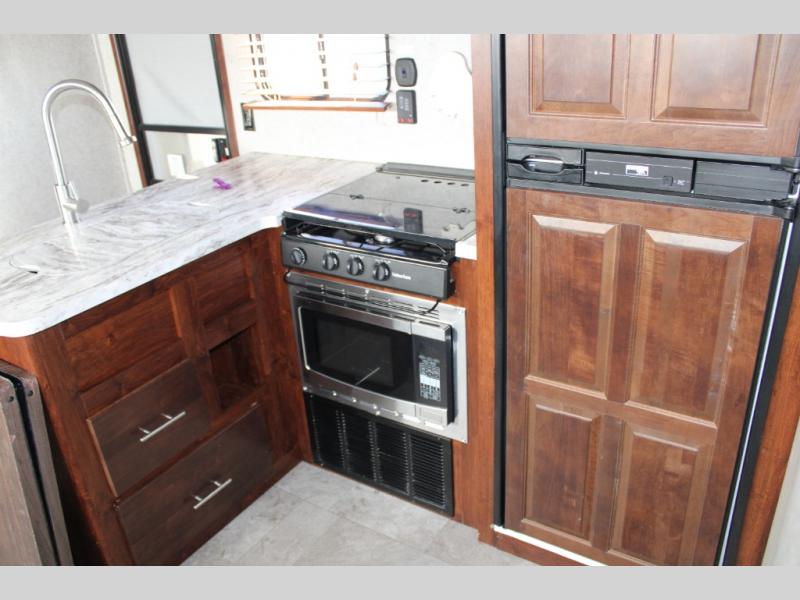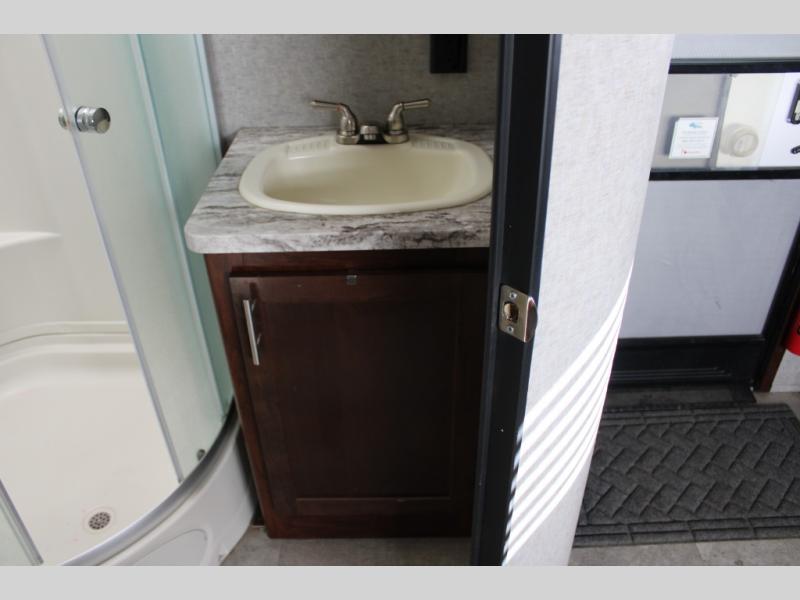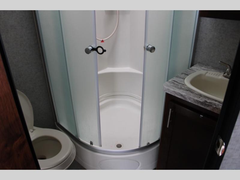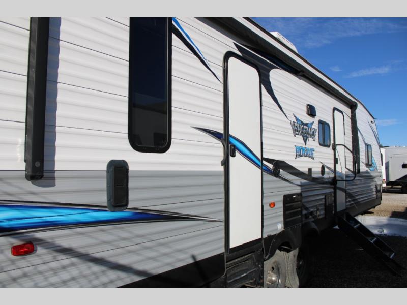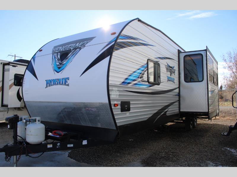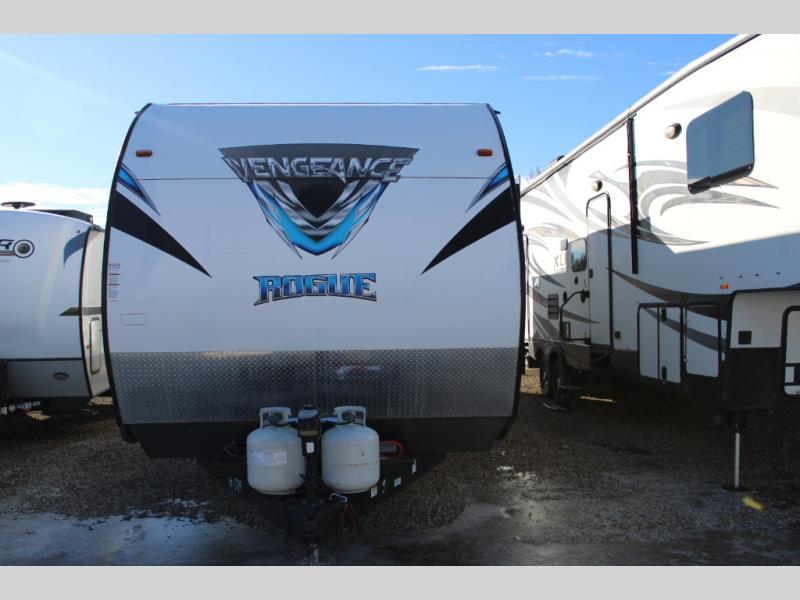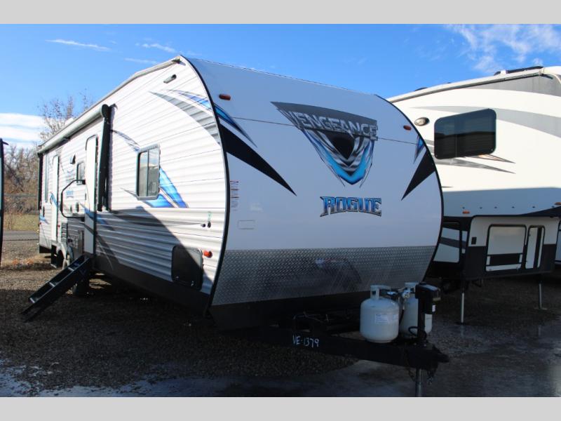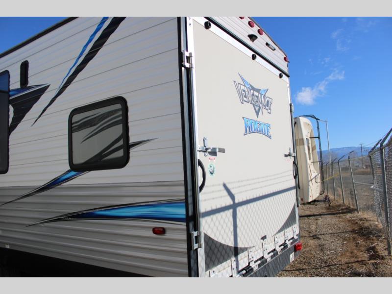 For any outdoor adventure you will want a Vengeance Rogue toy hauler travel trailer! These models feature an 8 cu. ft. refrigerator, a ramp door which allows easy loading and unloading, AM/FM stereo with indoor/outdoor speakers and a DVD player. With the enclosed underbelly you can now camp in all types of weather. After a day of playing outdoors then come back to your trailer and easily clean up at the outside shower.