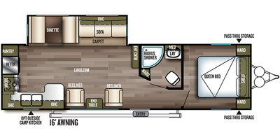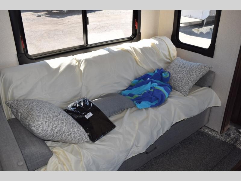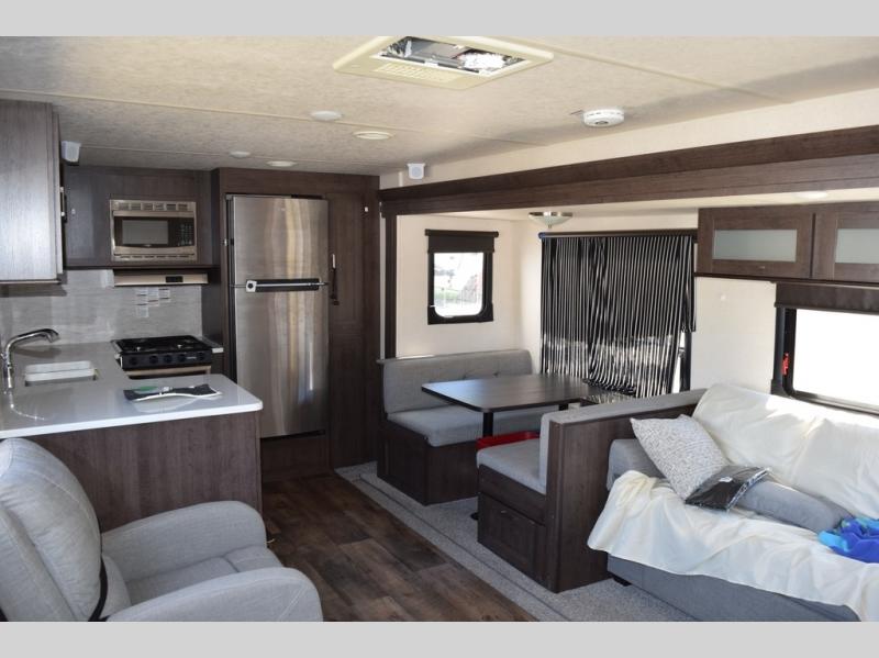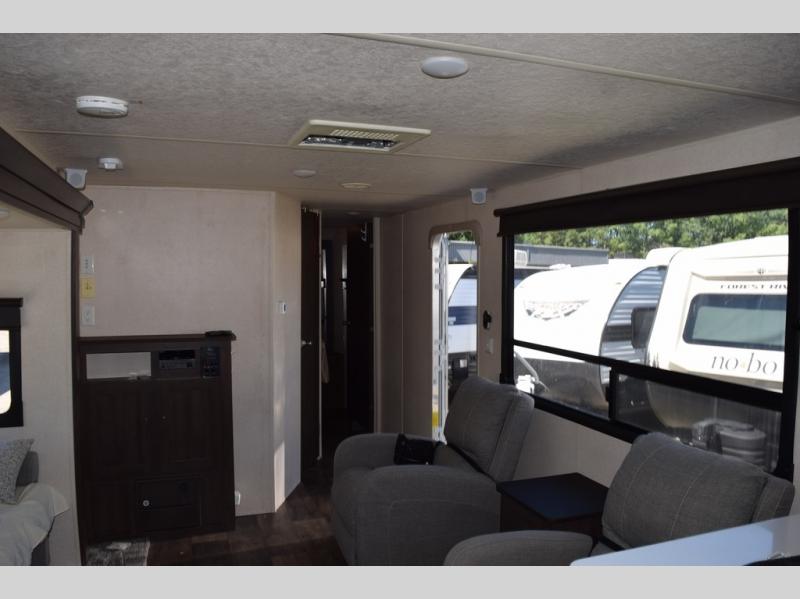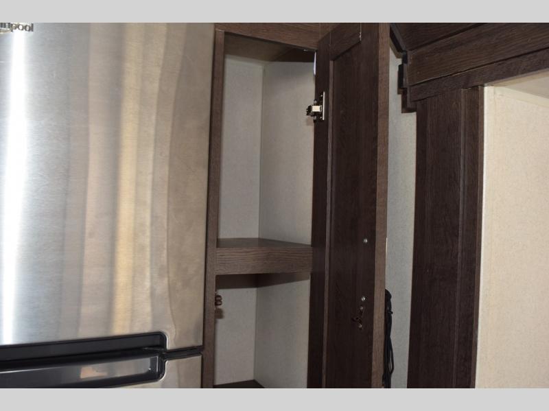 What I liked most: Easy to walk around the bed in the master bedroom. Open and light decor styling in the living areas. Plenty of seating with the dual recliners and opposite facing love seat. Ability to access the storage in the front of the loveseat. Plenty of good storage in the rear kitchen. Pantry appears small until you open it and realize it's wider than the cabinet door is iteself.