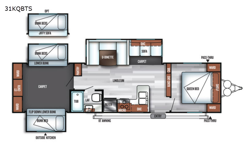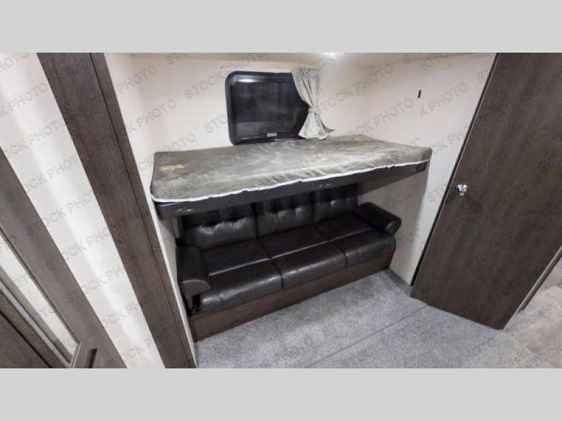 Come load up your whole family and still have room for a guest or two when you choose to camp with this Salem 31KQBTS travel trailer by Forest River. In the rear bunk house there are dual opposing slide outs with bunk beds. Along the rear wall you will find two wardrobes for all of the hang up clothes plus an entertainment center. The kitchen area features a large residential sink, plus all of the appliances needed to make your favorite meals. Within the roadside slide out there is a u-dinette and a sofa with an overhead cabinet. Mom and dad will enjoy the private front bedroom. Here you will find a queen bed, two wardrobes and a shelf. Outside there are a few more features to draw your attention such as an exterior kitchen, an 18' awning, and more storage space!