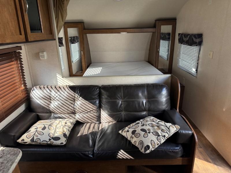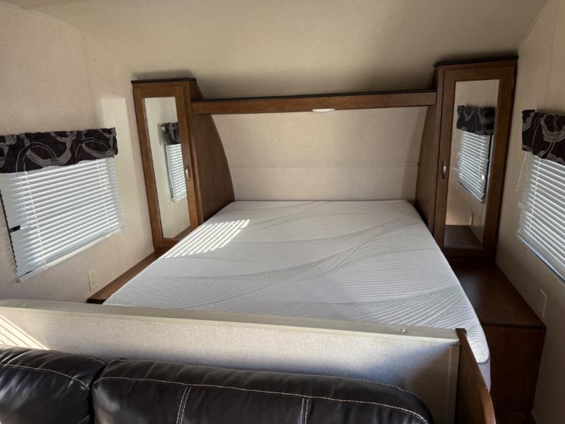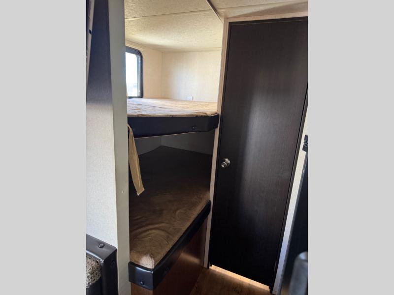 Load up this lightweight travel trailer with double-size bunks and head to your favorite campsite! There is plenty of seating and sleeping spaces between the rear bunks, the custom king bed with Versa Tilt, the booth dinette, and the sofa. The front bed has a closet and a privacy curtain to draw at night. The refrigerator will keep your perishables fresh, and the cooktop is just waiting for you to prepare a delicious home cooked meal.
