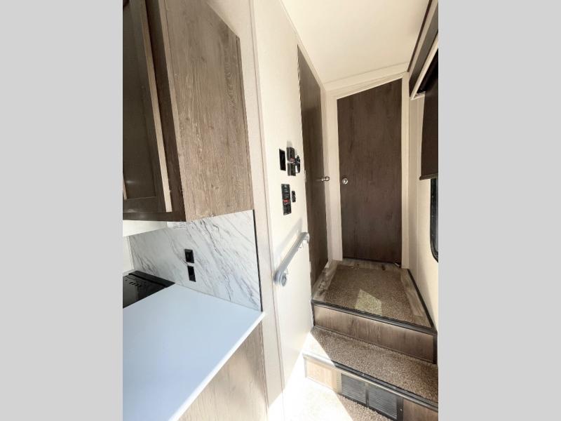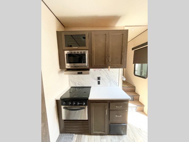 As you enter this fifth wheel, to your left there is a slide with a corner entertainment center and a free-standing table with chairs. Along the rear wall you will find two lounge chairs with a table between. The second slide in this area offers a tri-fold sofa, pantry, and refrigerator. Along the interior wall there is a three burner range and extra counter space. The kitchen sink is located in the center island.