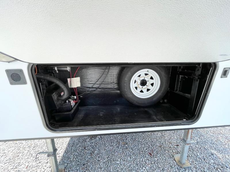 The front bedroom offers a custom king bed slide with corner shelf, full front wardrobe with shelf and optional washer/dryer prep, plus a large dresser.