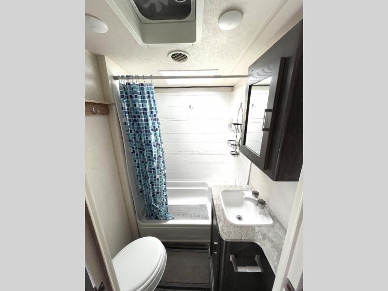 Stepping up the stairs, the side aisle bathroom is on your left. Inside the bath you will find a toilet, residential tub/shower with seat, sink, and handy medicine cabinet.