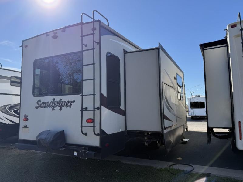 When you choose to camp with a Sandpiper fifth wheel by Forest River you are choosing a quality built fifth wheel with plenty of features and comforts to go around. Along the exterior there are large tinted windows, a "One Touch" Dometic electric awning with an LED light strip, 2 LED lighted exterior speakers, plus a docking station for easy winterization, hot and cold spray port, black tank flush, and pull valves for the tanks. Inside there is Beauflor rustic wood plank linoleum, a decorative backsplash, a 40" flat screen LED HDTV, plus a 9 cu. ft. stainless refrigerator. You can also choose from a few optional packages such as the Polar Tech Package, the Premium Package Plus which is offered for a limited time, and the Sandpiper Signature Package.