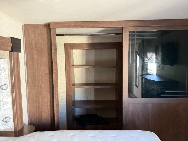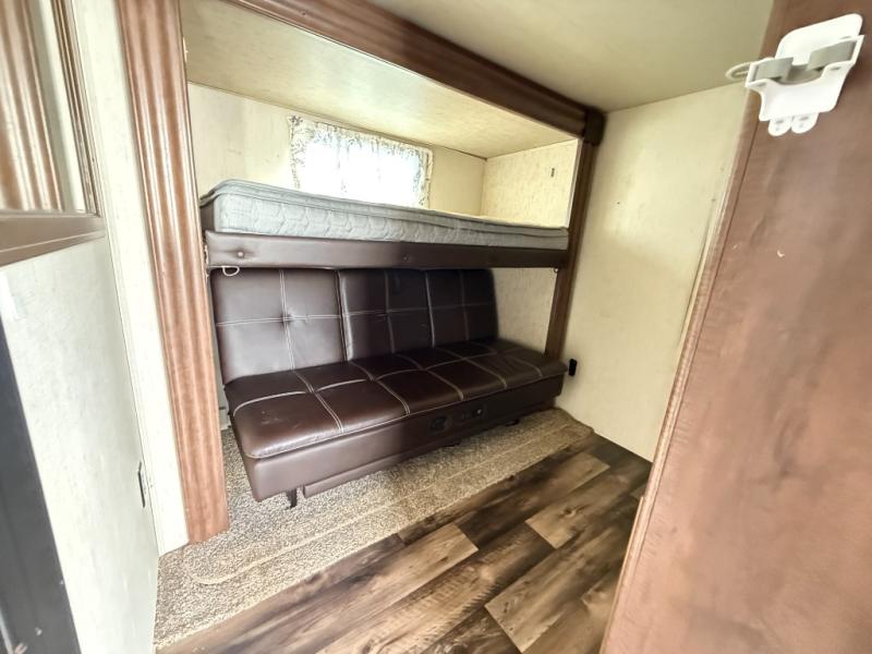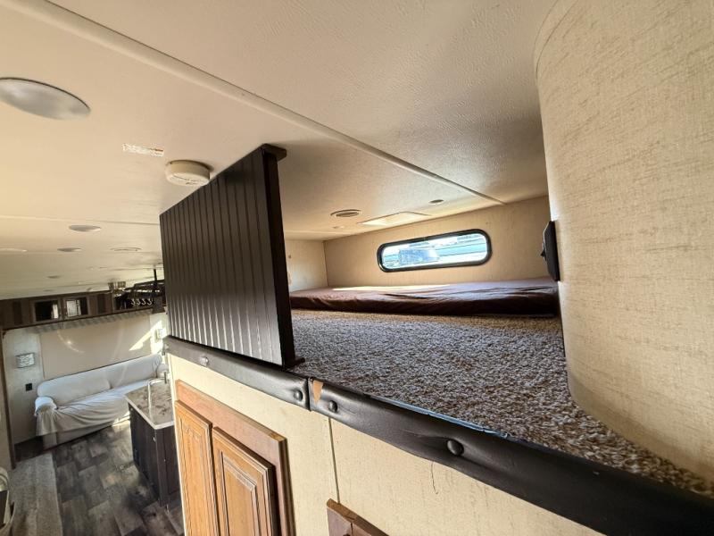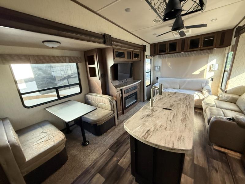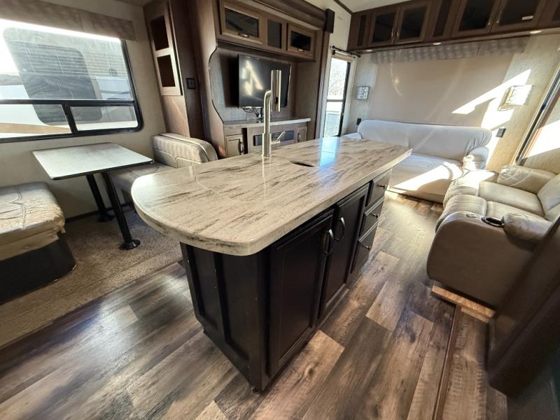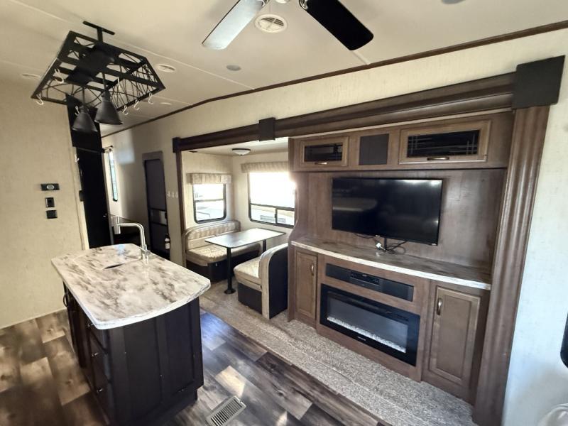 For the family friendly fifth wheel you will want this Sandpiper 372LOK by Forest River. You will enjoy the convenience of two kitchens - one inside and one outside. Almost straight in from the door is the second bedroom which can easily double as a den. Above this room there is a loft which features sleeping space for two people. In the combined kitchen and living area there is an island with pendant lights and extra counter space to work. You can easily relax in this living area with an entertainment center, fireplace, and theater seating!