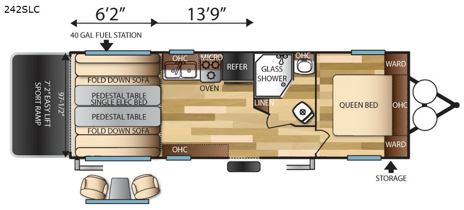 Step inside using the side main entry door, or through the rear 7'2" easy lift up sport ramp door. There are dual facing fold down sofas with pedestal tables between for mealtime, hanging out, or even sleeping space once folded down. Above you will find a single electric bed which allows for a bit more sleeping space.
