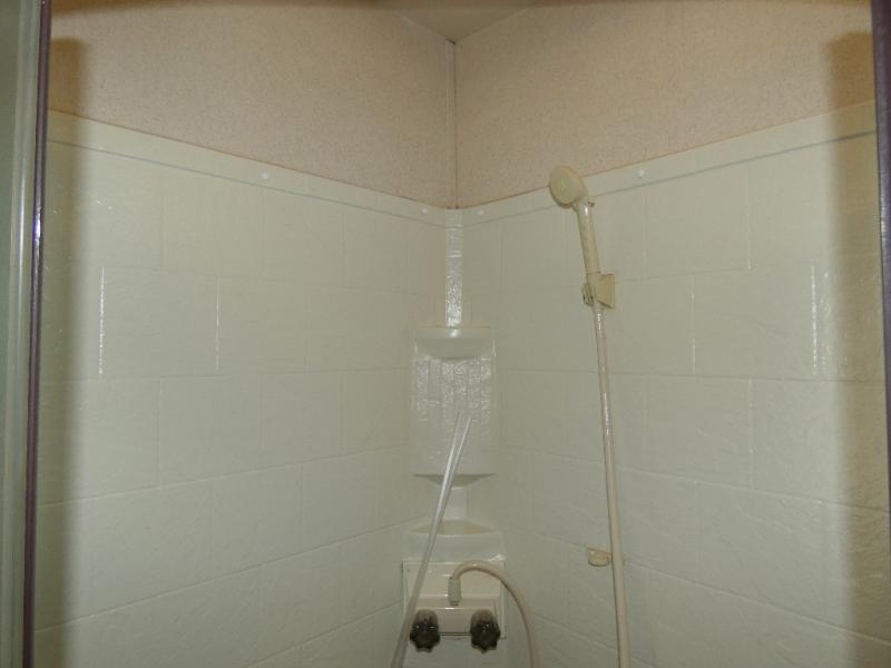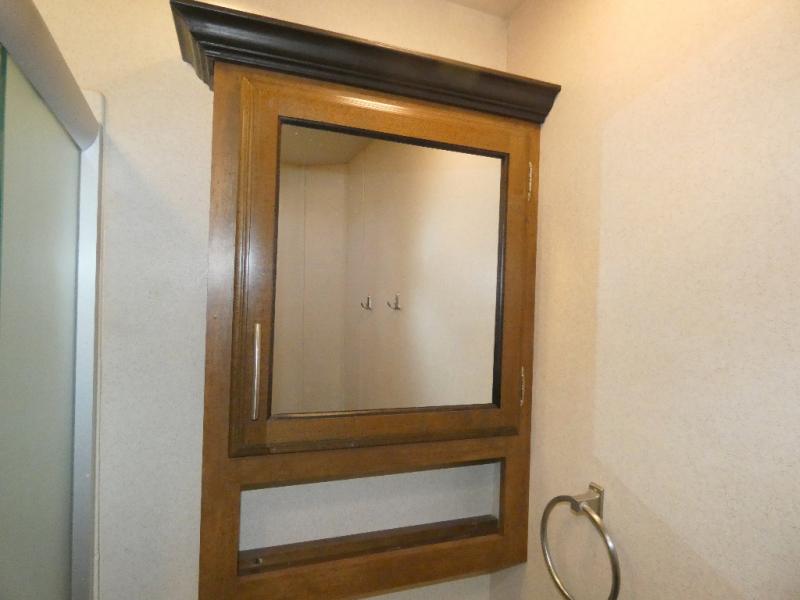 The side aisle full bathroom includes a toilet, linen storage, a corner glass shower, a vanity sink, and a medicine cabinet.
