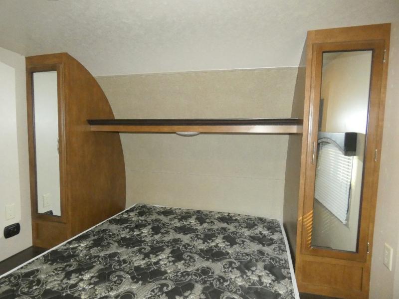 The front bedroom includes a walk around queen bed with a wardrobe on each side and overhead cabinets.