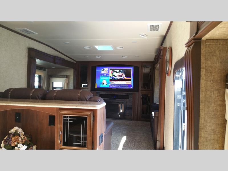 The double entry doors provide easy access, while the expansive pass-through storage ensures that all your travel essentials are conveniently within reach. The master bedroom welcomes you with a luxurious residential queen memory foam mattress, complemented by a spacious closet prepped for a washer/dryer and large wardrobe. The bathroom is equipped with an impressive walk-in shower featuring a thoughtfully designed seat adorned with an etched tile pattern, perfect for unwinding after a day of exploration. The heart of this RV lies in its stunning kitchen. You'll enjoy cooking on residential countertops paired with an island that boasts a double sink illuminated by stylish pendant lighting. With premium stainless-steel appliances and ample storage space, you'll find every amenity needed to create gourmet meals on the road. Wrap up your day in the elegantly designed front living room, featuring two tri-fold hide-a-bed sofas and theater seating that beckons relaxation. A sophisticated front entertainment center complete with a fireplace to set the perfect ambiance for cozy evenings spent indoors. Each detail of this RV has been meticulously crafted, featuring Beauflor® linoleum flooring resembling rustic wood planks, mocha accent crown molding over kitchen cabinets, decorative backsplashes, and a premium soundbar integrated with a flush-mounted DVD player. Constructed utilizing state-of-the-art materials such as welded aluminum-framed vacuum bonded laminated superstructure, R-10E sidewall, a fully enclosed underbelly, a drop frame, and enclosed & heated dump valves.