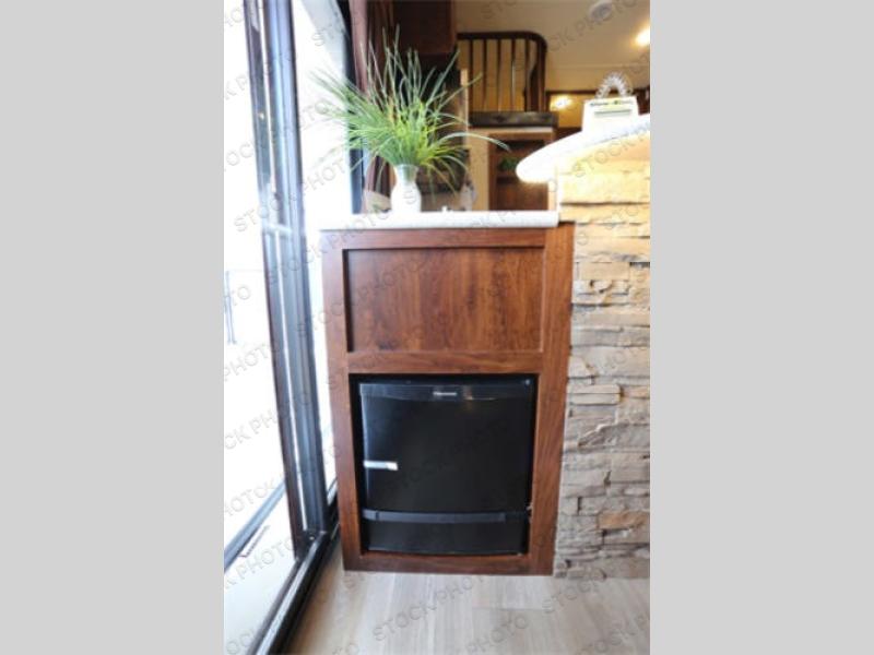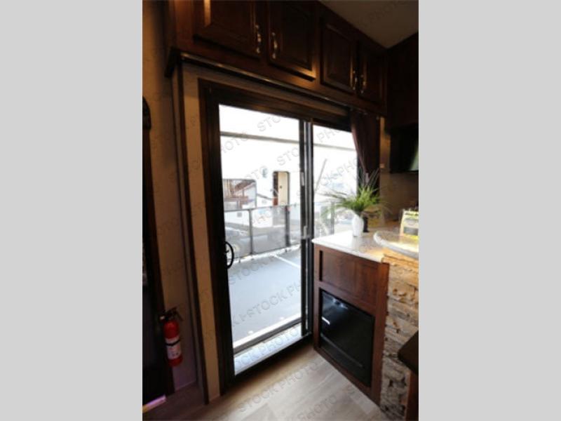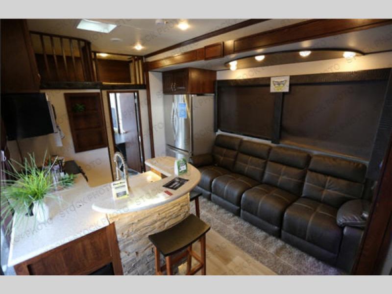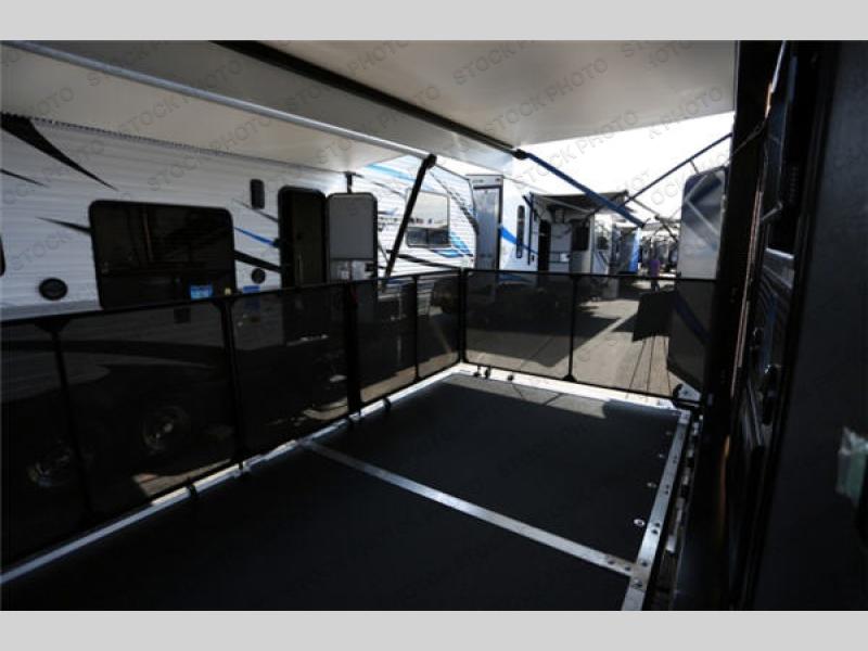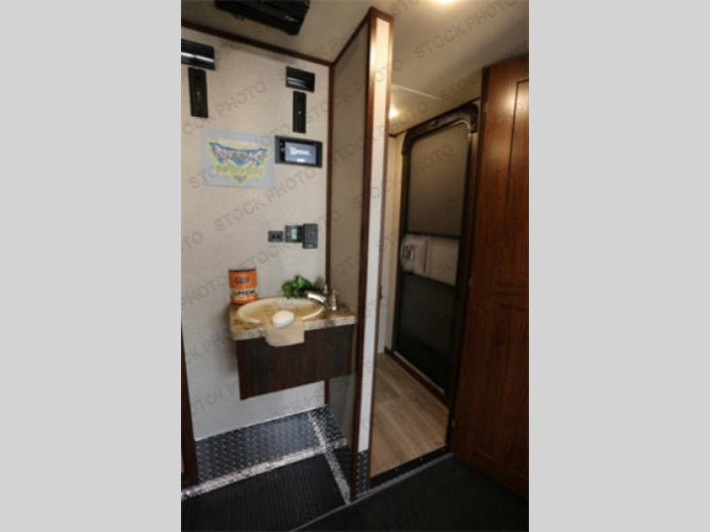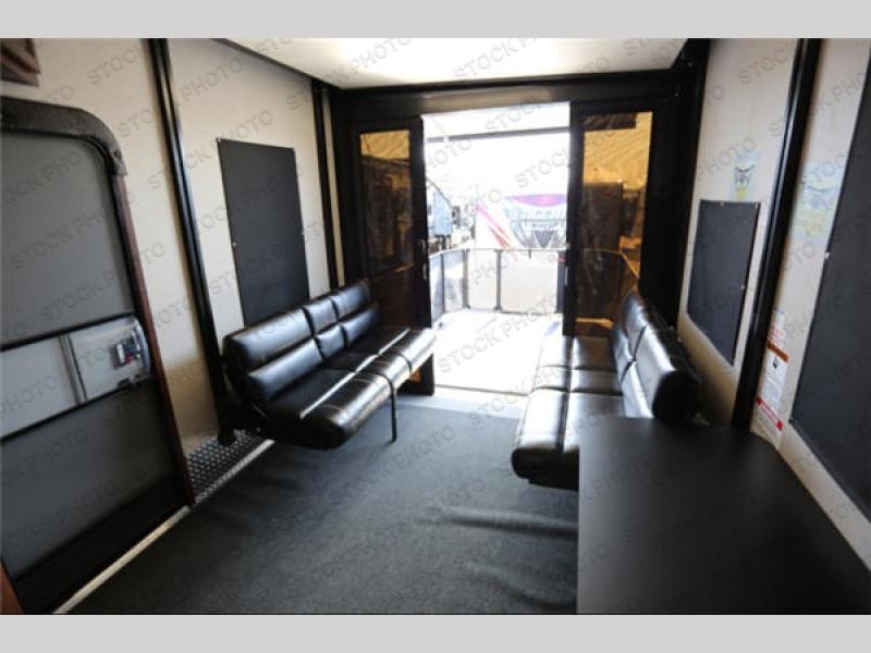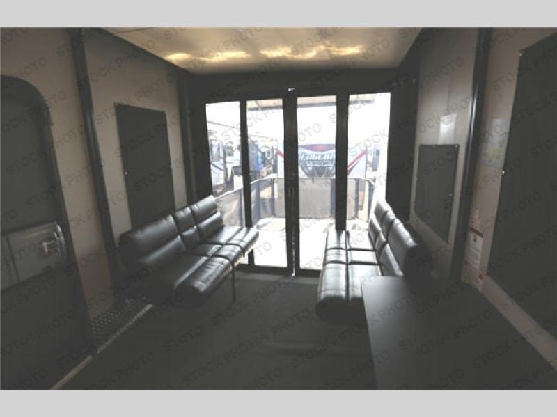 The fun doesn't have to stop out on the trails with this Vengeance Touring Edition unit. You can easily continue the party once back at camp. Head inside and get cleaned up. There is a convenient half bath off the garage area which features 12' of space along the roadside and 10'10" along the curbside. You also have a full bath with large 48" x 30" shower including a seat up front. Grab some refreshments and snacks and head out onto the side raised patio deck to enjoy. You can add optional patio steps to have easy access from the ground outside if you wish. If the weather is a bit chilly take the party inside where you have a large entertainment center with theater seating for four, plus bar stools at the counter. You can also hang out in the garage area where there are dual flip sofas beneath the electric lift bed as well as a TV at the head of the garage space to enjoy. A second rear patio deck system is also available making this a true outdoor party space for all to enjoy!