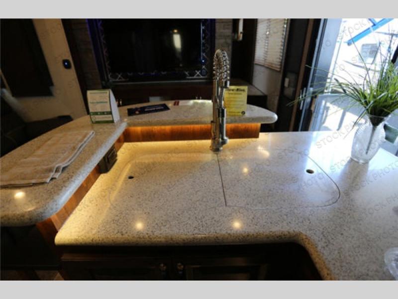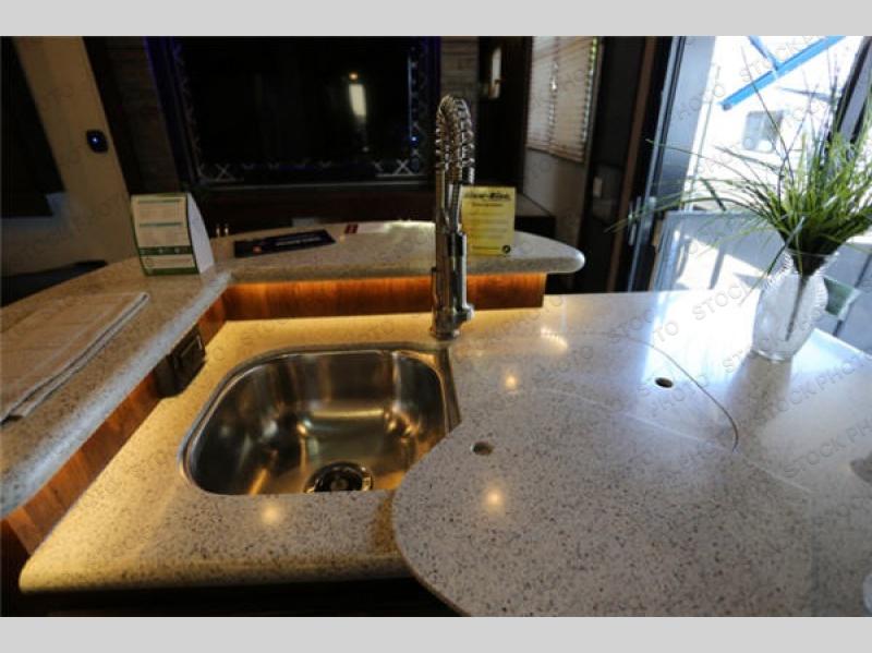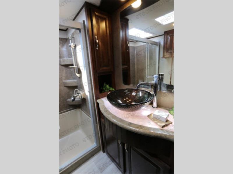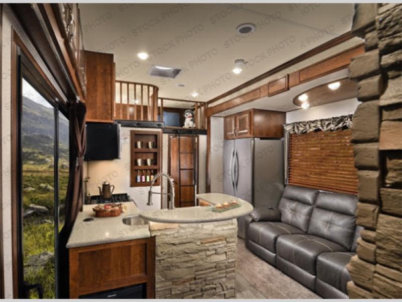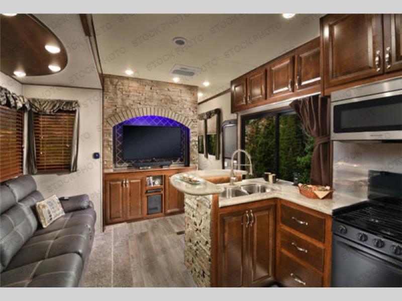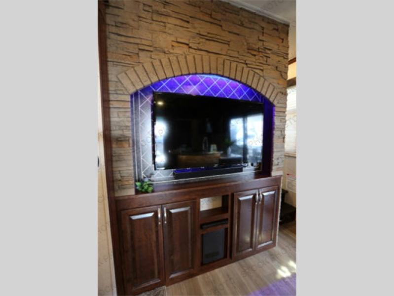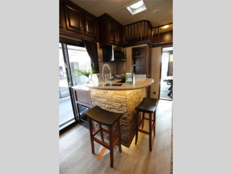 The fun doesn't have to stop out on the trails with this Vengeance Touring Edition unit. You can easily continue the party once back at camp. Head inside and get cleaned up. There is a convenient half bath off the garage area which features 12' of space along the roadside and 10'10" along the curbside. You also have a full bath with large 48" x 30" shower including a seat up front. Grab some refreshments and snacks and head out onto the side raised patio deck to enjoy. You can add optional patio steps to have easy access from the ground outside if you wish. If the weather is a bit chilly take the party inside where you have a large entertainment center with theater seating for four, plus bar stools at the counter. You can also hang out in the garage area where there are dual flip sofas beneath the electric lift bed as well as a TV at the head of the garage space to enjoy. A second rear patio deck system is also available making this a true outdoor party space for all to enjoy!