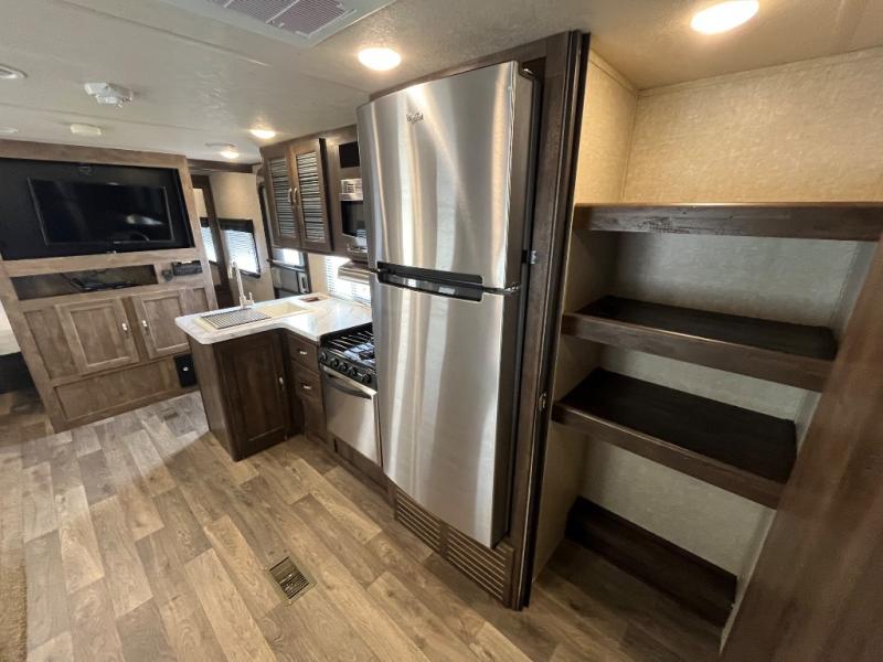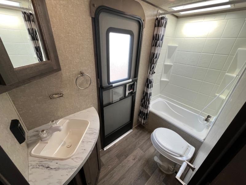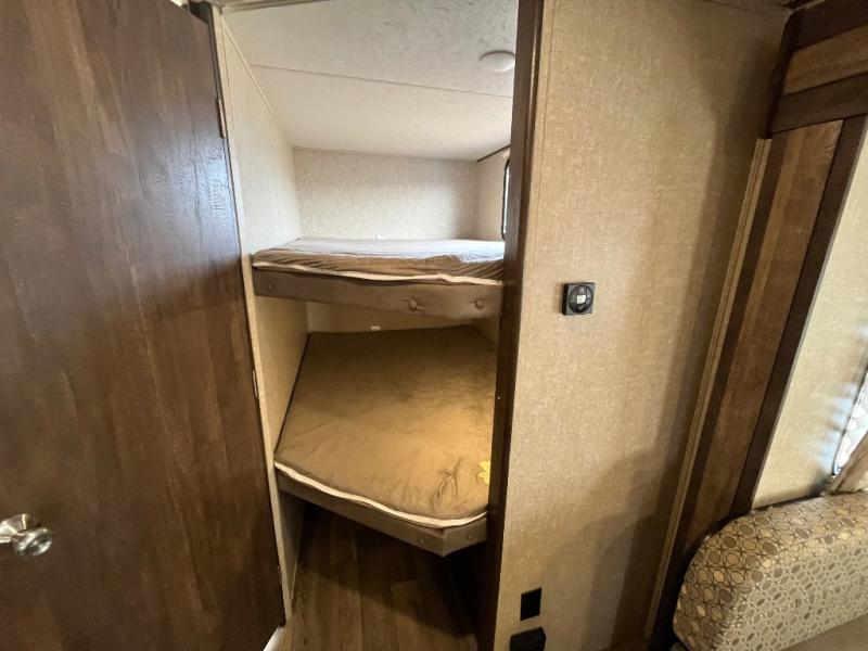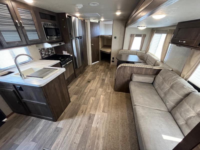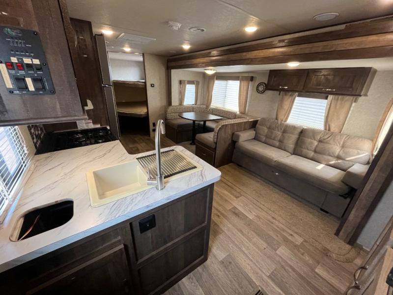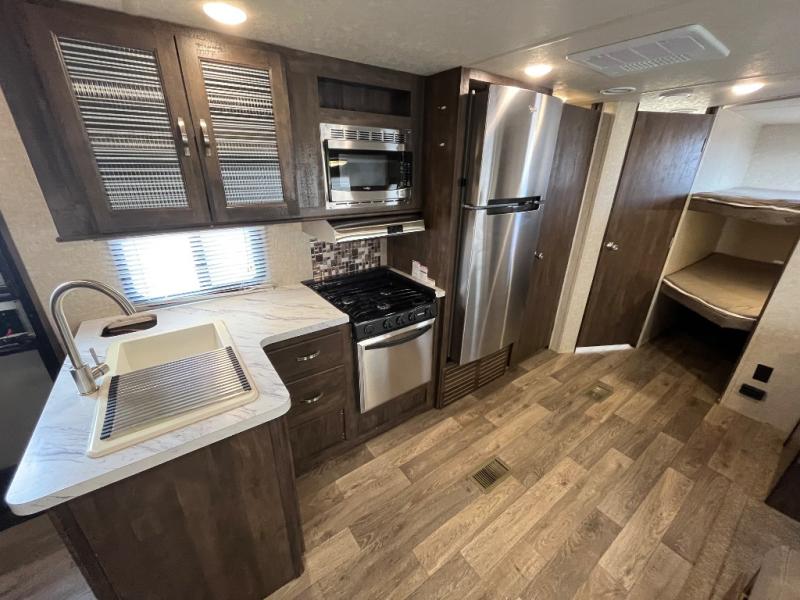 Just imagine making memories that will last a lifetime with this Vibe Extreme Lite 261BHS travel trailer. There are plenty of spots for your whole family to comfortably sleep from the double size bunk beds, the U-shaped dinette and jiffy sofa within the single slide out, and you can sleep on the queen bed in the private master bedroom. The kitchen offers a stainless steel package, solid surface countertops, a decorative backsplash, and a pantry for your dry goods, plus more. You will also appreciate the two entry doors into the trailer especially the second entry allowing quick access into the bathroom from outside. There are many more features to see, and options to choose from.
