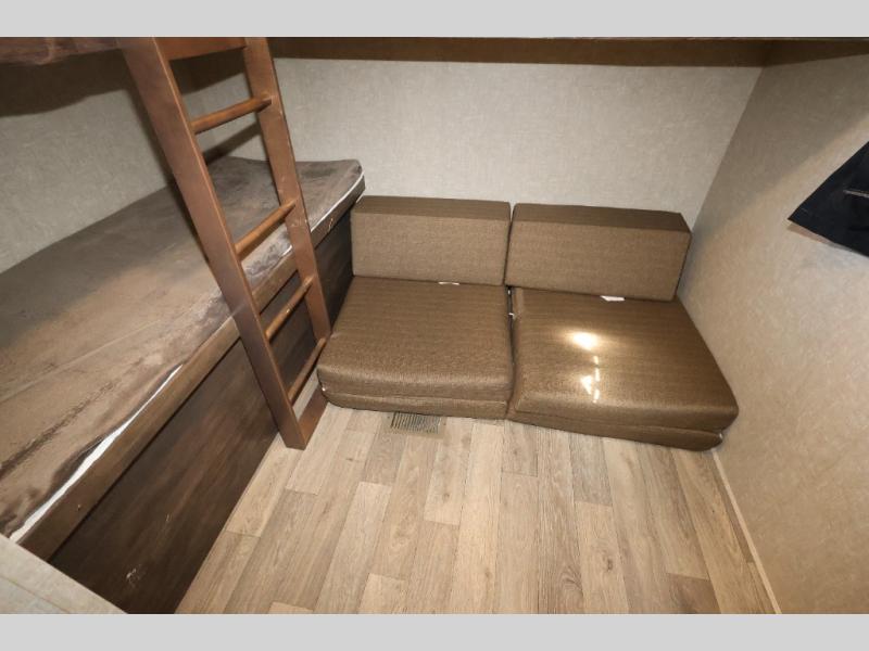 This Vibe Extreme Lite travel trailer is perfect for a larger family with its rear bunkhouse, the large slide for added interior floor space, and more! Model 287QBS has plenty of room for everyone throughout this unit. Just imagine the kids hanging out in their own bunkhouse with triple bunk beds and two Vibe cubes. You also have the choice of folding down the U-shaped dinette and jiffy sofa for additional sleeping space in the slide out, plus there is a queen bed for yourself. The kitchen offers a stainless steel package, plenty of solid surface countertops including an L-shaped counter, a decorative backsplash, and appliances to make meals the whole trip. You might even choose the optional exterior kitchen. Take a look, you will be an owner tomorrow!