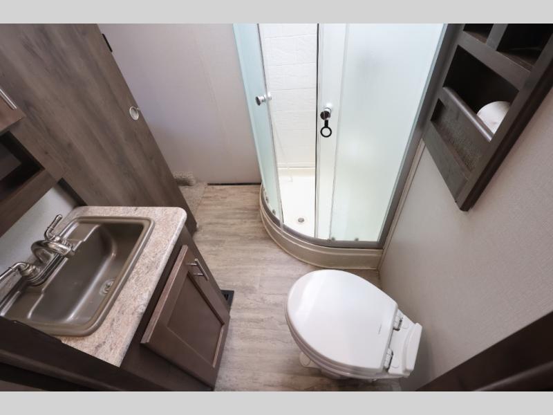 Along the rear wall there is a u-dinette. Here you can enjoy meals and snacks throughout the day, and at night easily convert the dinette into a sleeping area. The slide out along the road side features a sofa, a pantry for your dry goods, and a refrigerator. Optional theatre seating can be added in place of the sofa.