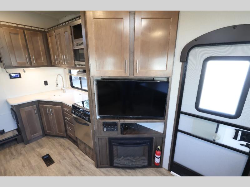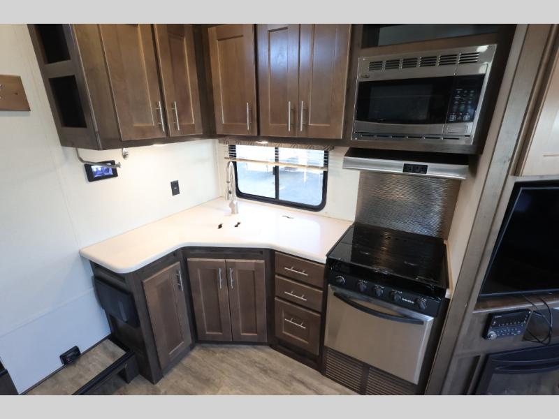 To the right of the entry door there is an entertainment center with a swing arm TV. This allows the TV to be easily seen from any spot in the combined kitchen and living area. The optional fireplace will add a nice cozy ambiance on those chilly evenings. Just past the entertainment center you will find a three burner range, plenty of overhead cabinets, and an angled double sink.