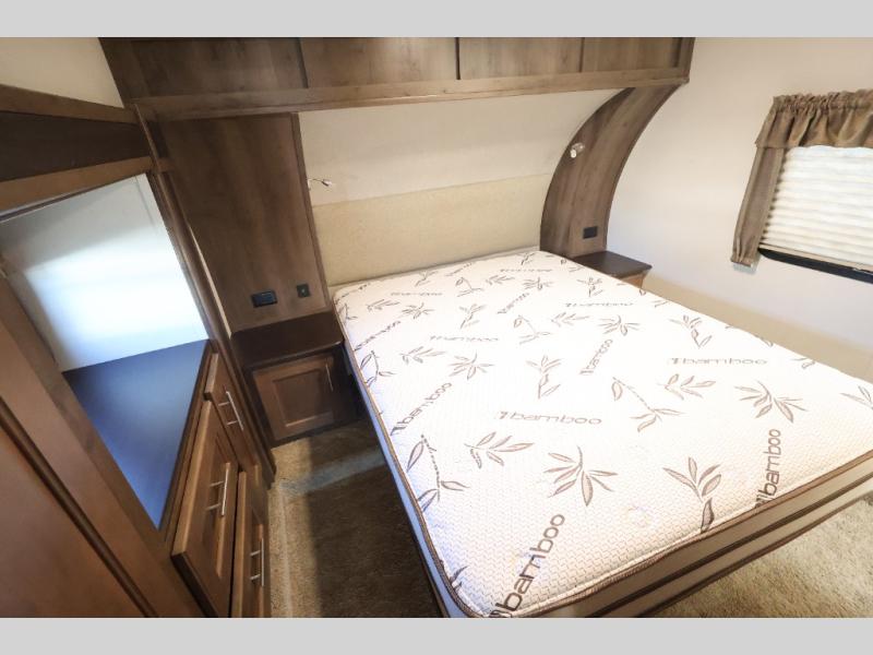 In the front room you will find the second slide out. Here there is a linen cabinet, a wardrobe, and a desk top with drawers. The bedroom also features a queen bed, an overhead cabinet, a nightstand, and a wardrobe.