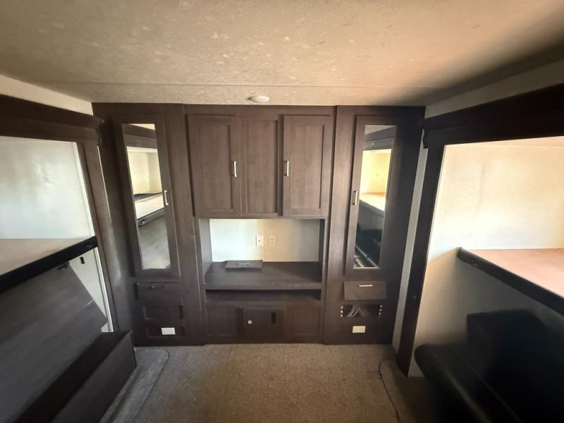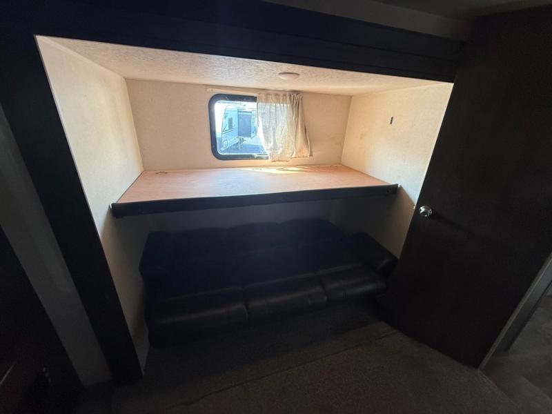With triple slide outs and a rear bunkhouse, everyone can have their own space inside this 31KQBTS Wildwood travel trailer by Forest River. This is quite a luxurious, spacious model. The bunkhouse is quite large with the dual opposing slide outs and the full wall cabinet/shelf space. Your kids will love spending time in here. The large slide out in the living space opens up the living area quite nicely and gives plenty of places for relaxing, playing games, or just enjoying one another's company. You can sleep up to ten individuals in this unit. If you kids have friends come along, they can share their bunk with a friend. The u-shaped dinette and sofa fold down and then there is the private front bedroom with a queen bed. For some fun outside, put out the awning and use the outdoor kitchen for preparing your snacks!