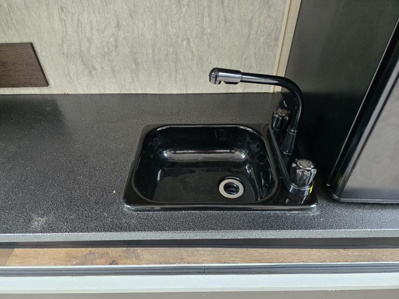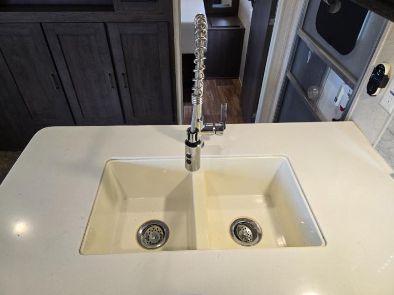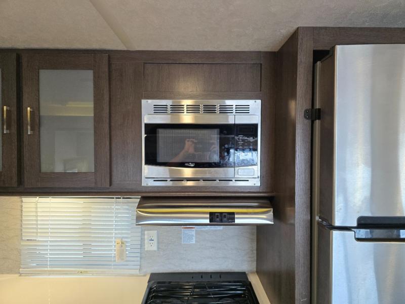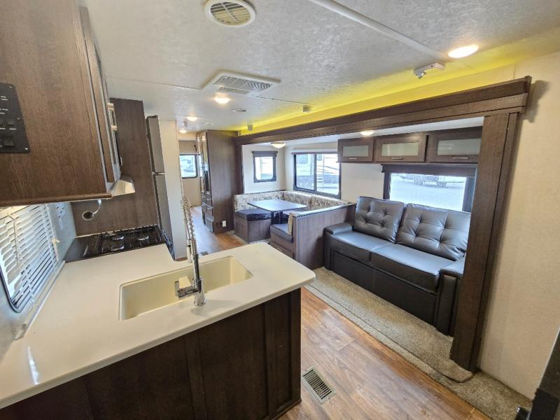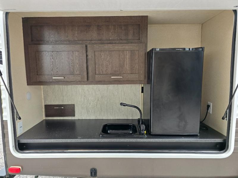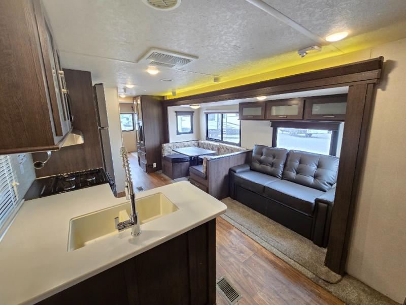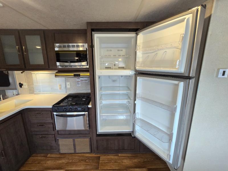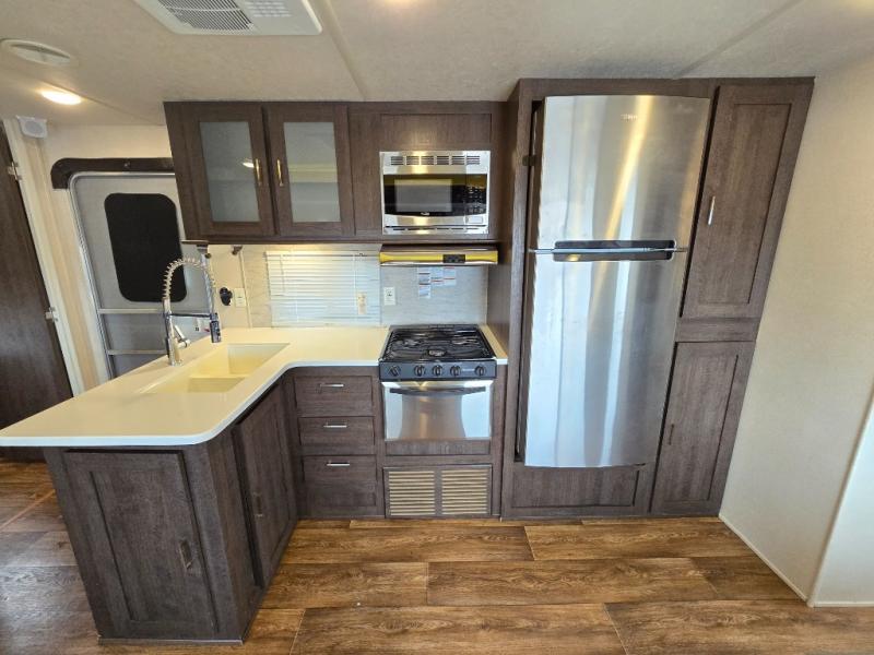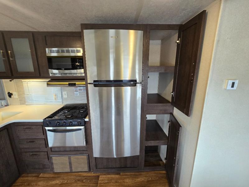 Inside the 32BHDS Wildwood travel trailer by Forest River you will find double slides and a rear bunkhouse which your kids will love! The bunkhouse is great for three to four kids, there are three bunks, two uppers and one lower. The one side that has an upper bunk has a ladder over some shelve/cupboards. Parents are on the opposite end with their own private front bedroom. The living space has a large slide out giving you a more open feel when in this area. The kitchen has an l-shaped counter which gives you some extra counter space for prepping food and the double sink is perfect for cleaning up afterward. Outside you have an outdoor kitchen and an 18' awning for some shade on a sunny day.