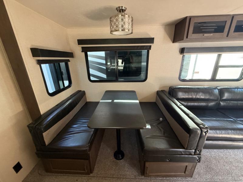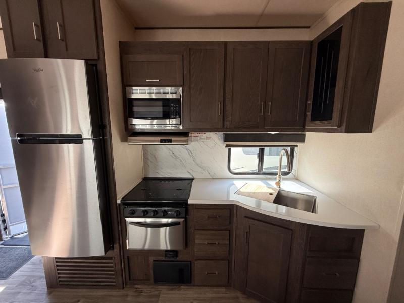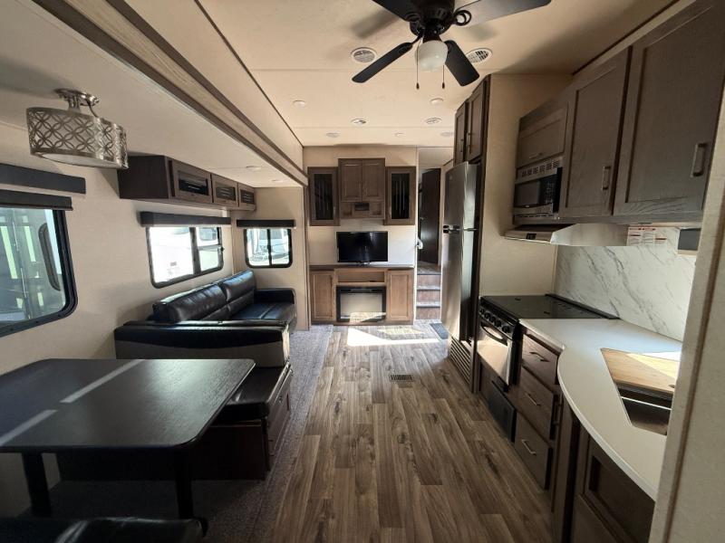 As you step inside the main entry to your left there is a pantry, refrigerator, three burner range, microwave, and a kitchen sink. On the opposite side of the fifth wheel you will find a slide out jumbo dinette and a tri-fold sofa. Next to the sofa you can enjoy relaxing while watching the entertainment center and fireplace. There are plenty of overhead cabinets in this combined kitchen and living area.