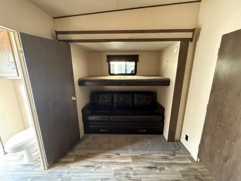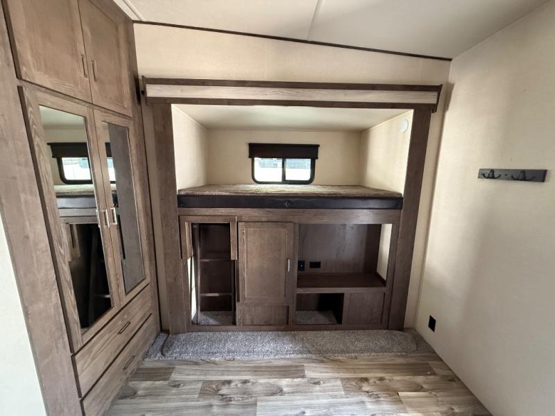 It's time to have "double" the fun in this Wildwood Heritage Glen 356QB fifth wheel by Forest River. There are TWO full baths including a residential tub/shower in the front bathroom, dual entry doors with a rare rear bathroom entry into the fifth wheel, a bunkhouse with twin beds, quad slide outs, plus a custom king bed in the master bedroom, and there is more!