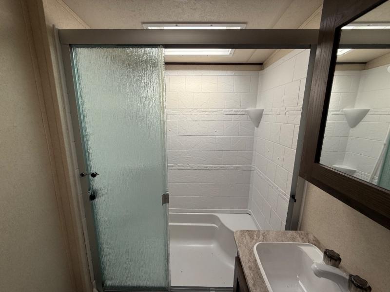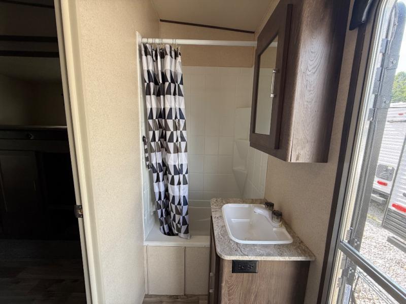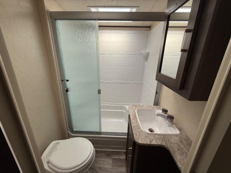 As you proceed through the front of the fifth wheel, and step up the stairs, the other full bathroom is on your left. Inside this bathroom you will find a residential tub/shower with seat, toilet, sink, and medicine cabinet.