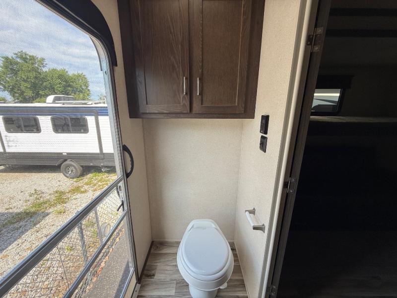 In the rear, you will find one of the full bathroom after you wall through the bunkhouse. There is a toilet, sink, medicine cabinet, and tub. There is also a rare rear entry door from the outside. This convenient entry allows for easy access to the bathroom or bunkhouse.