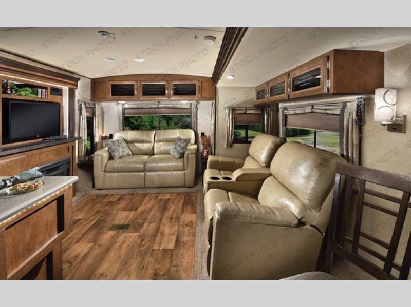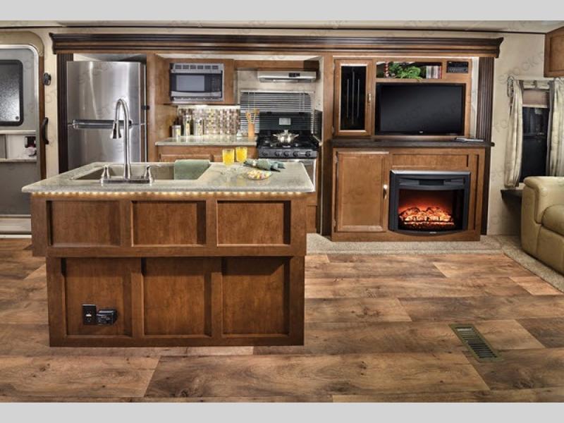 As you enter 272RL to your left you will find a slide out with a refrigerator, microwave, lots of counter space, three burner range, pantry, and an entertainment center with fireplace below. Along the rear wall there is a tri-fold sofa and end tables. The second slide has theater seating with cup holders, and a dinette. In the middle of the combined area there is a center island with a kitchen sink.