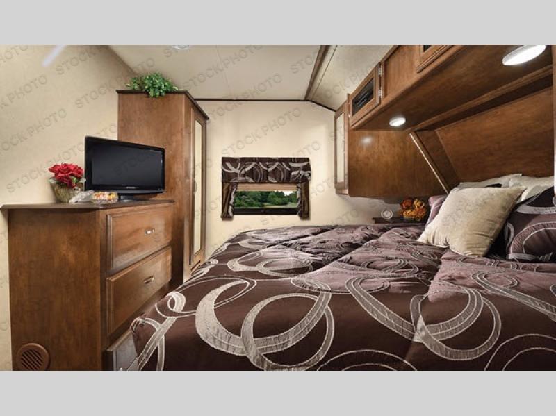 In the bedroom there is a queen bed, nightstands, overhead cabinets, and a laundry chute along the front wall. Plus you will find a dresser with TV hook-up and a wardrobe for additional storage needs.