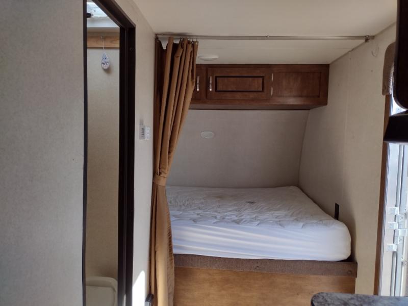 To the right of the entry door there is a queen bed with overhead cabinets running along the front side of the trailer, as well as over the head of the bed creating ample storage for your clothing and other belongings.