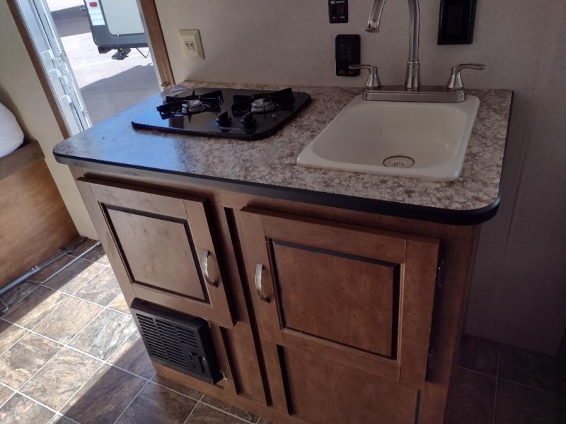 You can easily fix meals or snacks at the two burner cook-top, and clean up at the sink. Across the way there is a 4.3 cu. ft. electric RV refrigerator, and a TV shelf. There is even a bit of overhead cabinetry for dishes and things above the sink and stove top.