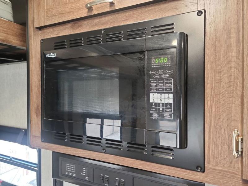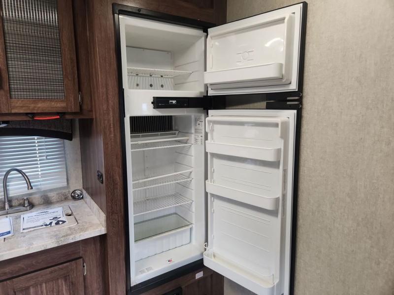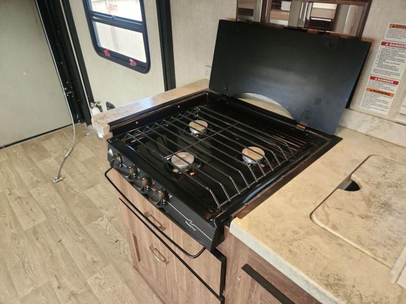 The kitchen area features a refrigerator, a double sink, and a three burner range. There are also overhead cabinets for all of your dishes and things, plus more overhead storage along the curb side wall to the left of the entry door, and more.
