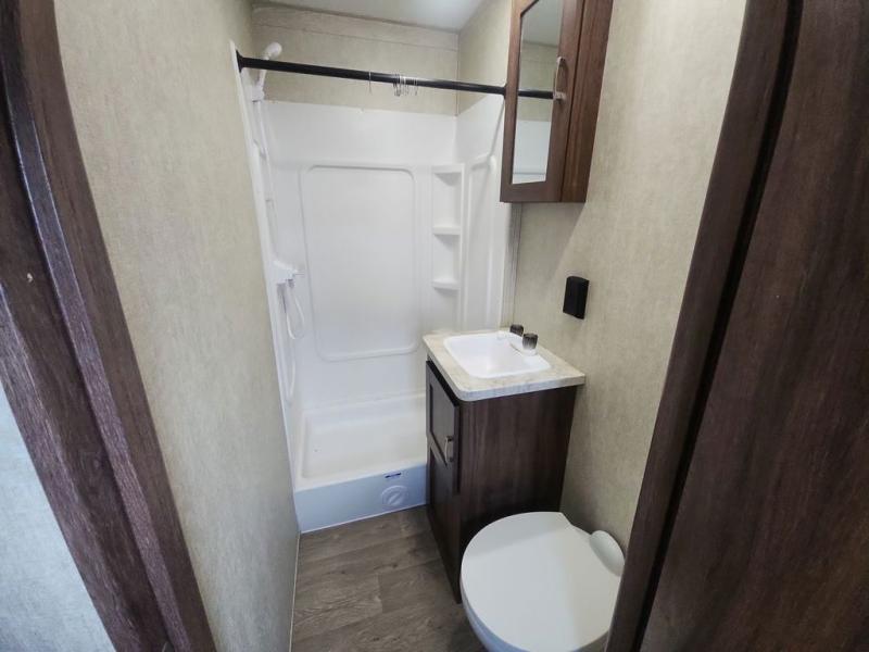 Straight in from the entry door you will find a convenient bathroom including a toilet, sink, and shower.