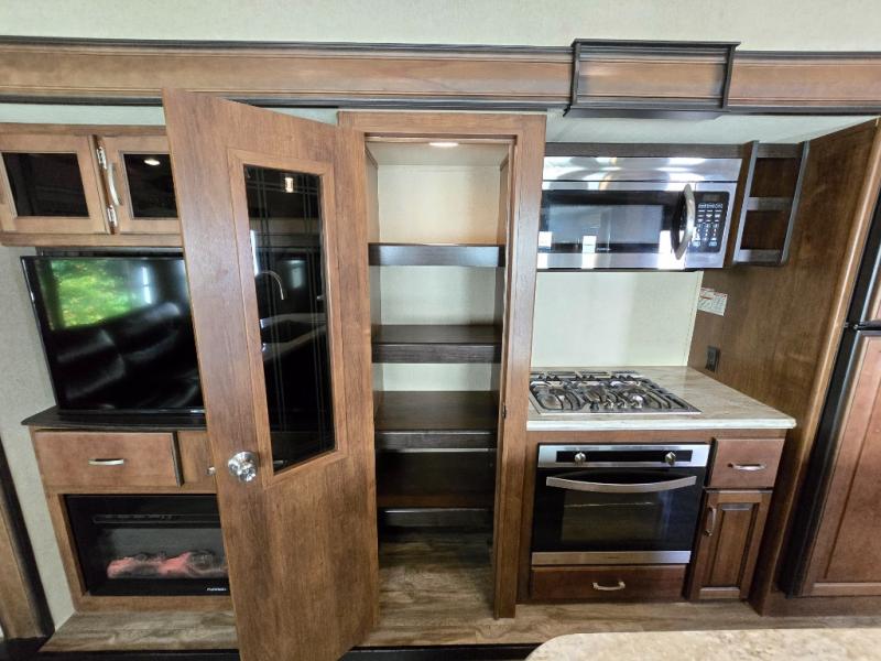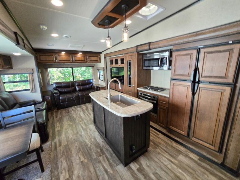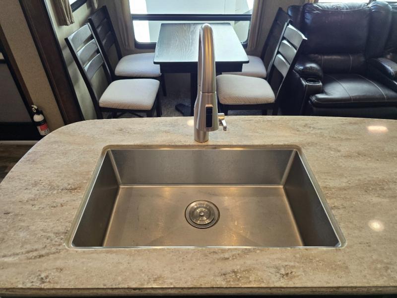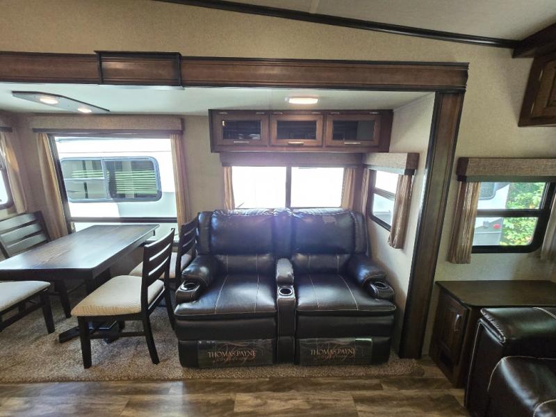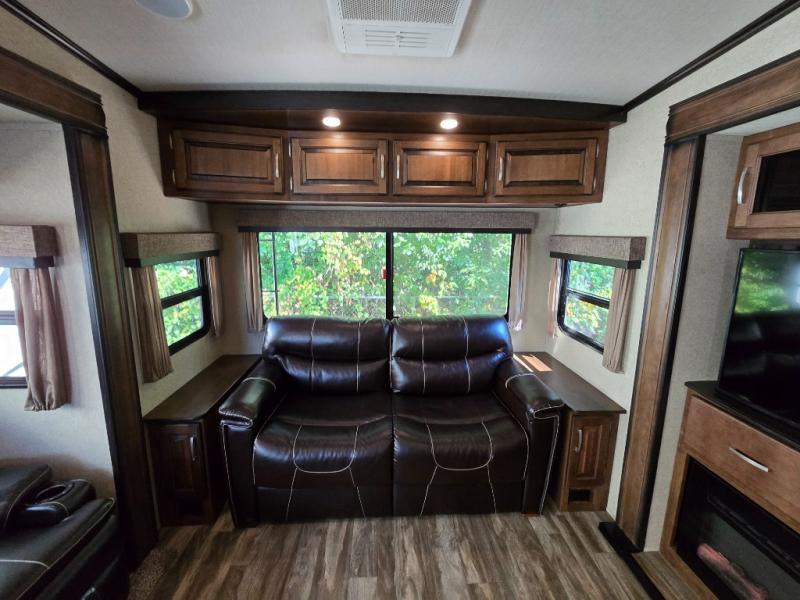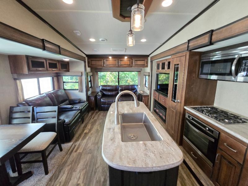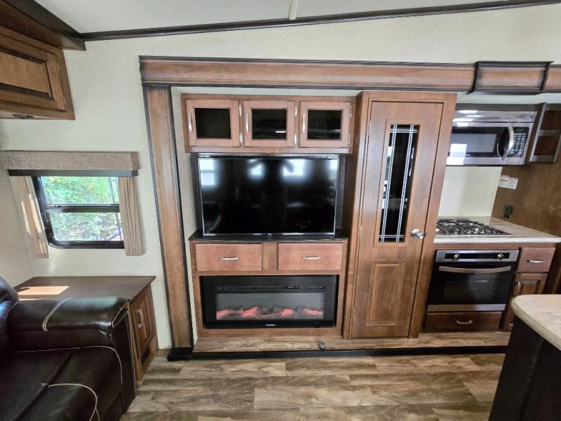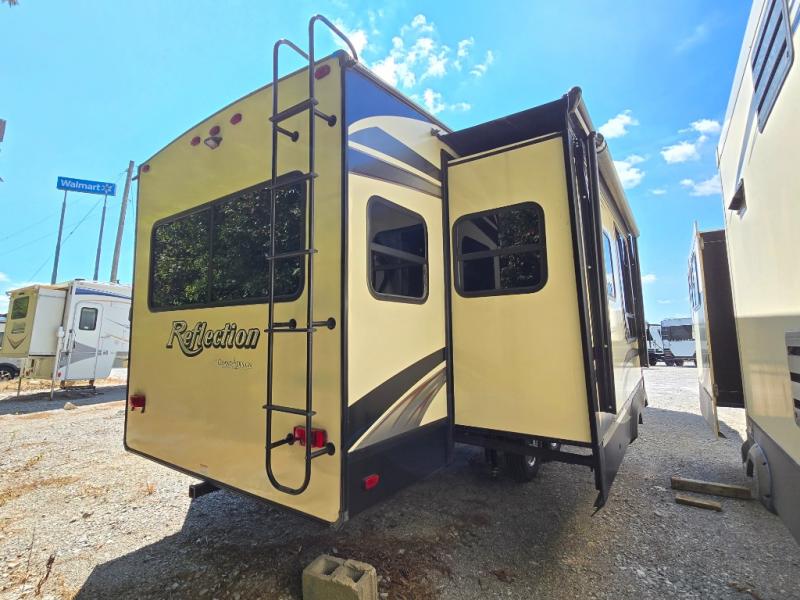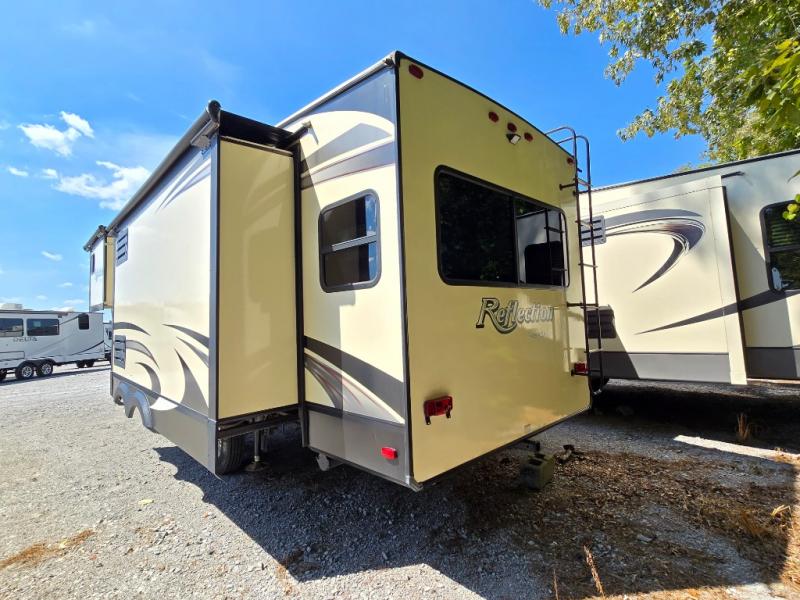 This Reflection 303RLS fifth wheel allows you to enjoy the comforts of home while moving from place to place with your spouse or smaller family. If you can imagine sitting in the rear living area on a tri-fold sofa bed after making dinner and serving the food from the kitchen island, this model is for you. You are sure to love the farm sink also. Even if you enjoy being outside most of the time, the weather might have you coming inside to watch the 40" TV or cozy up to the fireplace. Don't forget about storing your camp chairs and golf clubs in the unobstructed pass-through compartment if you need a dry place for those items. This model has many more standard features to enjoy and options to choose from, come see today!