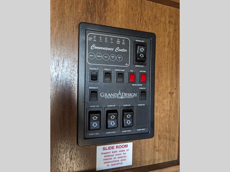 The Reflection by Grand Design offers luxury along with providing easy towing with the aerodynamic front cap with Max Turn radius to your favorite destinations. The Universal All-In-One docking station, LP Quick Connect, and One-Touch electric awning with LED light make setting up and packing up easy for those weekenders or full-timers that like to move around. Inside you will find the bedroom is complete with a pillowtop queen mattress, king size wardrobe, oversized underbed storage, and much more! The Arctic 4-Seasons Protection package allows you to camp anywhere and anytime of the year. Come choose your favorite model today!